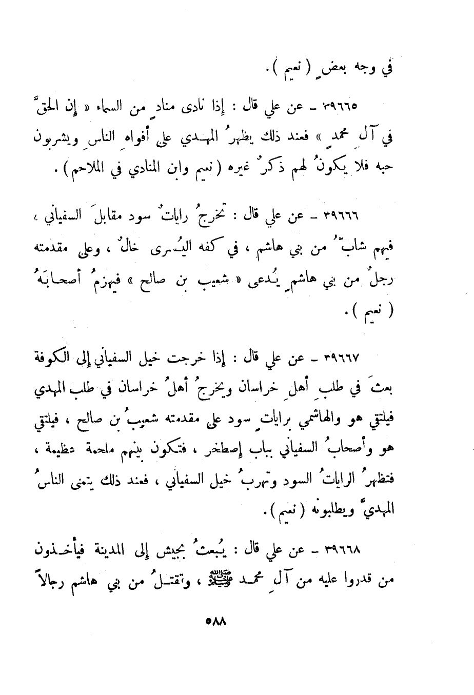39667- عن علي قال: "إذا خرجت خيل السفياني إلى الكوفة بعث في طلب أهل خراسان ويخرج أهل خراسان في طلب المهدي فيلتقي هو والهاشمي برايات سود على مقدمته شعيب بن صالح، فيلتقي هو وأصحاب السفياني بباب إصطخر، فتكون بينهم ملحمة عظيمة، فتظهر الرايات السود وتهرب خيل السفياني، فعند ذلك يتمنى الناس المهدي ويطلبونه." نعيم".
