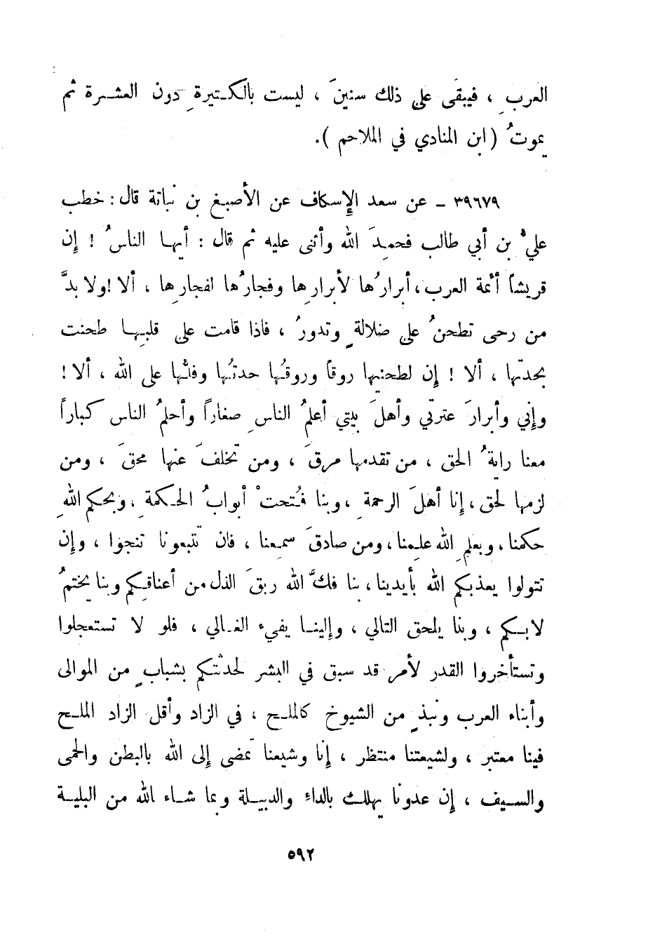 39679- عن سعد الإسكاف عن الأصبغ بن نباتة قال: خطب علي بن أبي طالب فحمد الله وأثنى عليه ثم قال: أيها الناس! إن قريشا أئمة العرب، أبرارها لأبرارها وفجارها لفجارها، ألا! ولابد من رحى تطحن على ضلالة وتدور، فإذا قامت على قلبها طحنت بحدتها، ألا! إن لطحنيها روقا وروقها حدتها وفلها على الله، ألا! وإني وأبرار عترتي وأهل بيتي أعلم الناس صغارا وأحلم الناس كبارا معنا راية الحق، من تقدمها مرق، ومن تخلف عنها محق، ومن لزمها لحق، إنا أهل الرحمة، وبنا فتحت أبواب الحكمة، وبحكم الله حكمنا، وبعلم الله علمنا، ومن صادق سمعنا، فإن تتبعونا تنجوا، وإن تتولوا يعذبكم الله بأيدينا، بنا فك الله ربق الذل من أعناقكم وبنا يختم لا بكم، وبنا يلحق التالي، وإلينا يفيء الغالي، فلولا تستعجلوا وتستأخروا القدر لأمر قد سبق في البشر لحدثتكم بشباب من الموالى وأبناء العرب ونبذ من الشيوخ كالملح، في الزاد وأقل الزاد الملح فينا معتبر، ولشيعتنا منتظر، إنا وشيعنا تمضى إلى الله بالبطن والحمى والسيف، إن عدونا يهلك بالداء والدبيلة وبما شاء الله من البلية