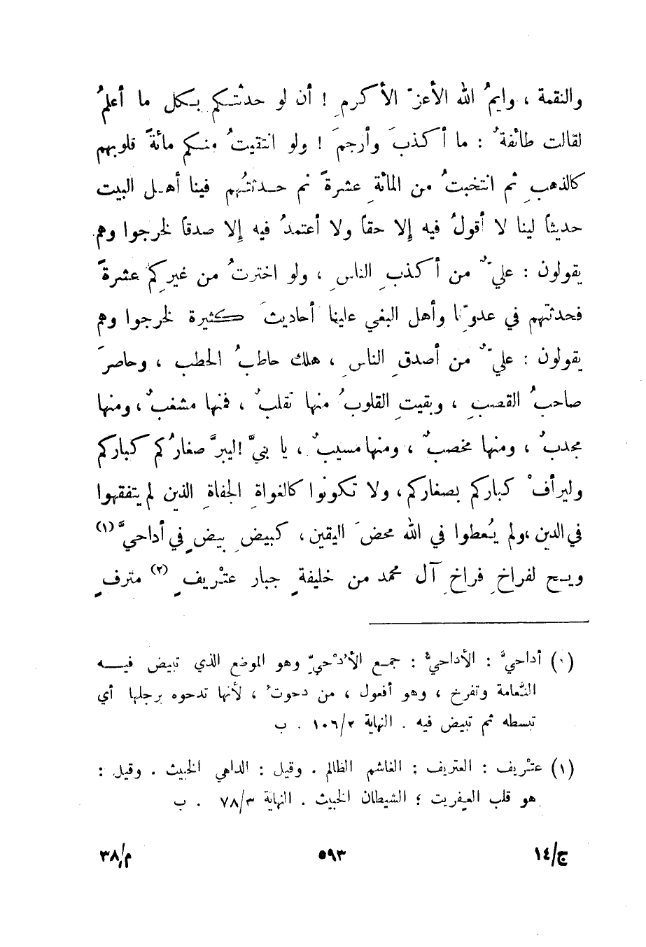 والنقمة. وايم الله الأعز الأكرم! أن لو حدثتكم بكل ما أعلم لقالت طائفة: ما أكذب وأرجم! ولو انتقيت منكم مائة قلوبهم كالذهب ثم انتخبت من المائة عشرة ثم حدثتهم فينا أهل البيت حديثا لينا لا أقول فيه إلا حقا ولا أعتمد فيه إلا صدقا لخرجوا وهم يقولون: علي من أكذب الناس، ولو اخترت من غيركم عشرة فحدثتهم في عدونا وأهل البغي علينا أحاديث كثيرة لخرجوا وهم يقولون: علي من أصدق الناس، هلك حاطب الحطب، وحاصر صاحب القصب، وبقيت القلوب منها تقلب، فمنها مشغب، ومنها مجدب، ومنها مخصب، ومنها مسيب، يا بني! ليبر صغاركم كباركم وليرأف كباركم بصغاركم، ولا تكونوا كالغواة الجفاة الذين لم يتفقهوا في الدين، ولم يعطوا في الله محض اليقين، كبيض بيض في أداحي1 ويح لفراخ فراخ آل محمد من خليفة جبار عتريف2 مترف