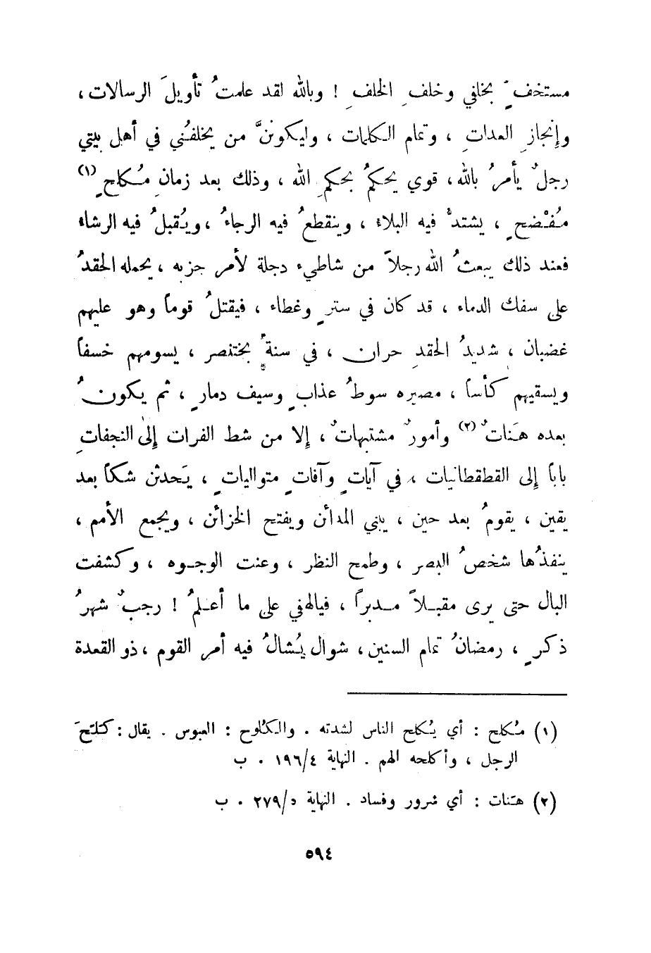 مستخف بخلفي وخلف الخلف! وبالله لقد علمت تأويل الرسالات، وإنجاز العدات، وتمام الكلمات، وليكونن من يخلفني في أهل بيتي رجل يأمر بالله، قوي يحكم بحكم الله، وذلك بعد زمان مكلح1 مفضح، يشتد فيه البلاء، وينقطع فيه الرجاء، ويقبل فيه الرشاء. فعند ذلك يبعث الله رجلا من شاطيء دجلة لأمر حزبه، يحمله الحقد على سفك الدماء، قد كان في ستر وغطاء، فيقتل قوما وهو عليهم غضبان، شديد الحقد حران، في سنة بختنصر، يسومهم خسفا ويسقيهم كأسا، مصيره سوط عذاب وسيف دمار، ثم يكون بعده هنات2 وأمور مشتبهات، إلا من شط الفرات إلى النجفات بابا إلى القطقطانيات، في آيات وآفات متواليات، يحدثن شكا بعد يقين، يقوم بعد حين، يبني المدائن ويفتح الخزائن، ويجمع الأمم، ينفذها شخص البصر، وطمح النظر، وعنت الوجوه، وكشفت البال حتى يرى مقبلا مدبرا، فيا لهفي على ما أعلم! رجب شهر ذكر، رمضان تمام السنين، شوال يشال فيه أمر القوم، ذو القعدة