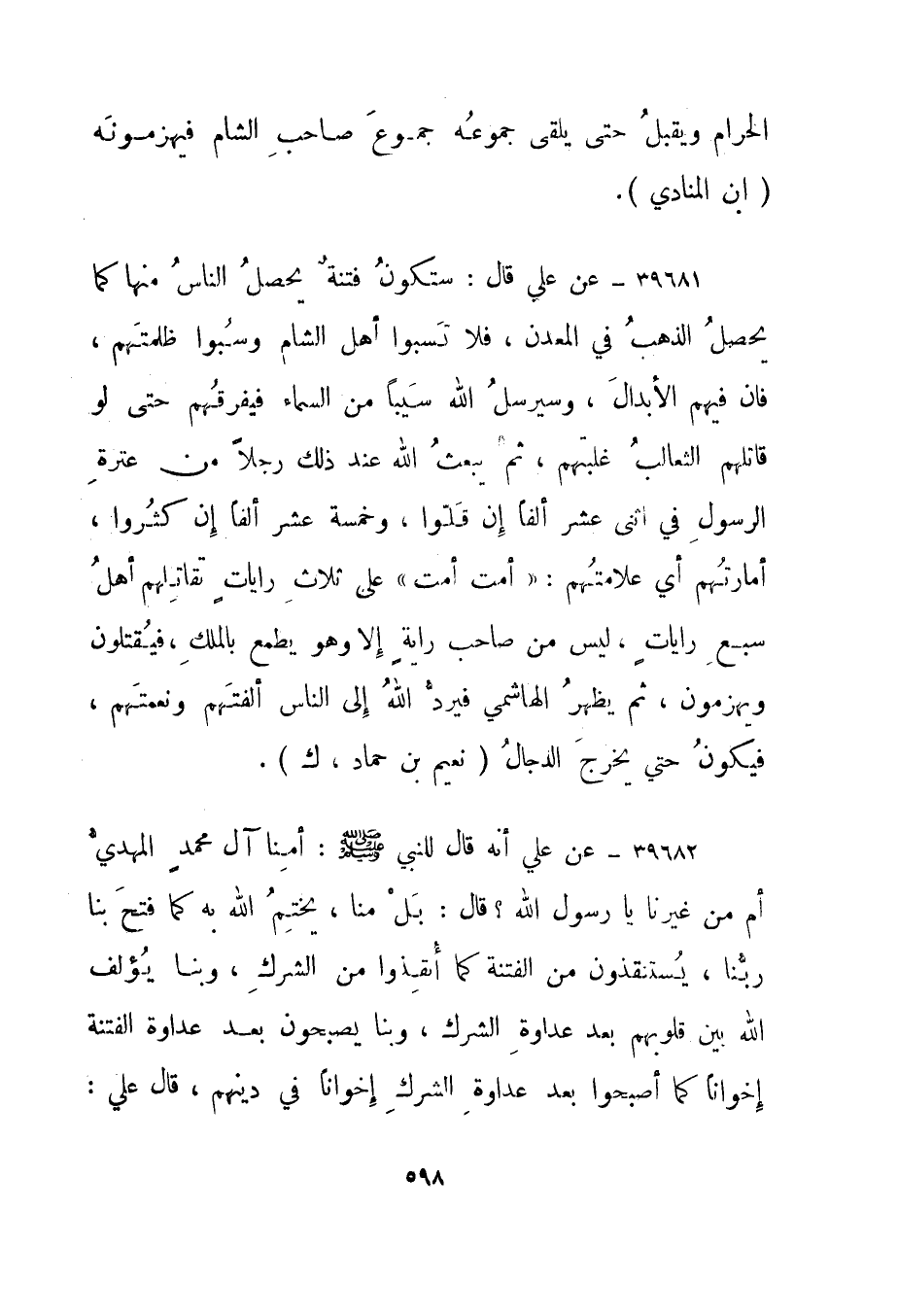 39682- عن علي أنه قال للنبي صلى الله عليه وسلم: أمنا آل محمد المهدي أم من غيرنا يا رسول الله؟ قال: "بل منا، يختم الله به كما فتح بنا ربنا، يستنقذون من الفتنة كما أنقذوا من الشرك، وبنا يؤلف الله بين قلوبهم بعد عداوة الشرك، وبنا يصبحون بعد عداوة الفتنة إخوانا كما أصبحوا بعد عداوة الشرك إخوانا في دينهم، قال علي: