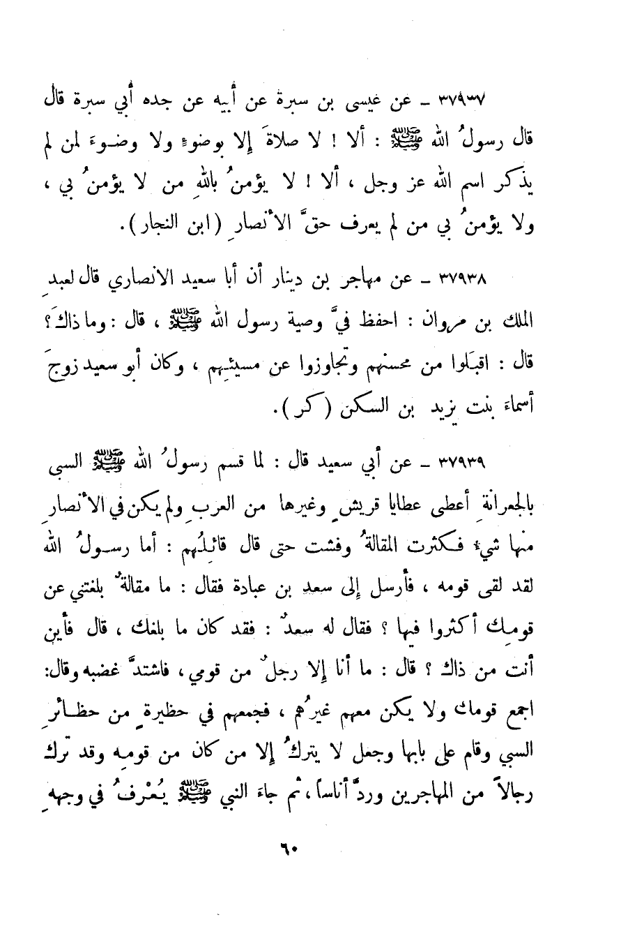 37939- عن أبي سعيد قال: لما قسم رسول الله صلى الله عليه وسلم السبى بالجعرانة أعطى عطايا قريش وغيرها من العرب ولم يكن في الأنصار منها شيء فكثرت المقالة وفشت حتى قال قائلهم: أما رسول الله لقد لقى قومه، فأرسل إلى سعد بن عبادة فقال: "ما مقالة بلغتني عن قومك أكثروا فيها؟ " فقال له سعد: فقد كان ما بلغك، قال "فأين أنت من ذاك؟ " قال: ما أنا إلا رجل من قومي، فاشتد غضبه وقال: "اجمع قومك ولا يكن معهم غيرهم،" فجمعهم في حظيرة من حظائر السبي وقام على بابها وجعل لا يترك إلا من كان من قومه وقد ترك رجالا من المهاجرين ورد أناسا، ثم جاء النبي صلى الله عليه وسلم يعرف في وجهه