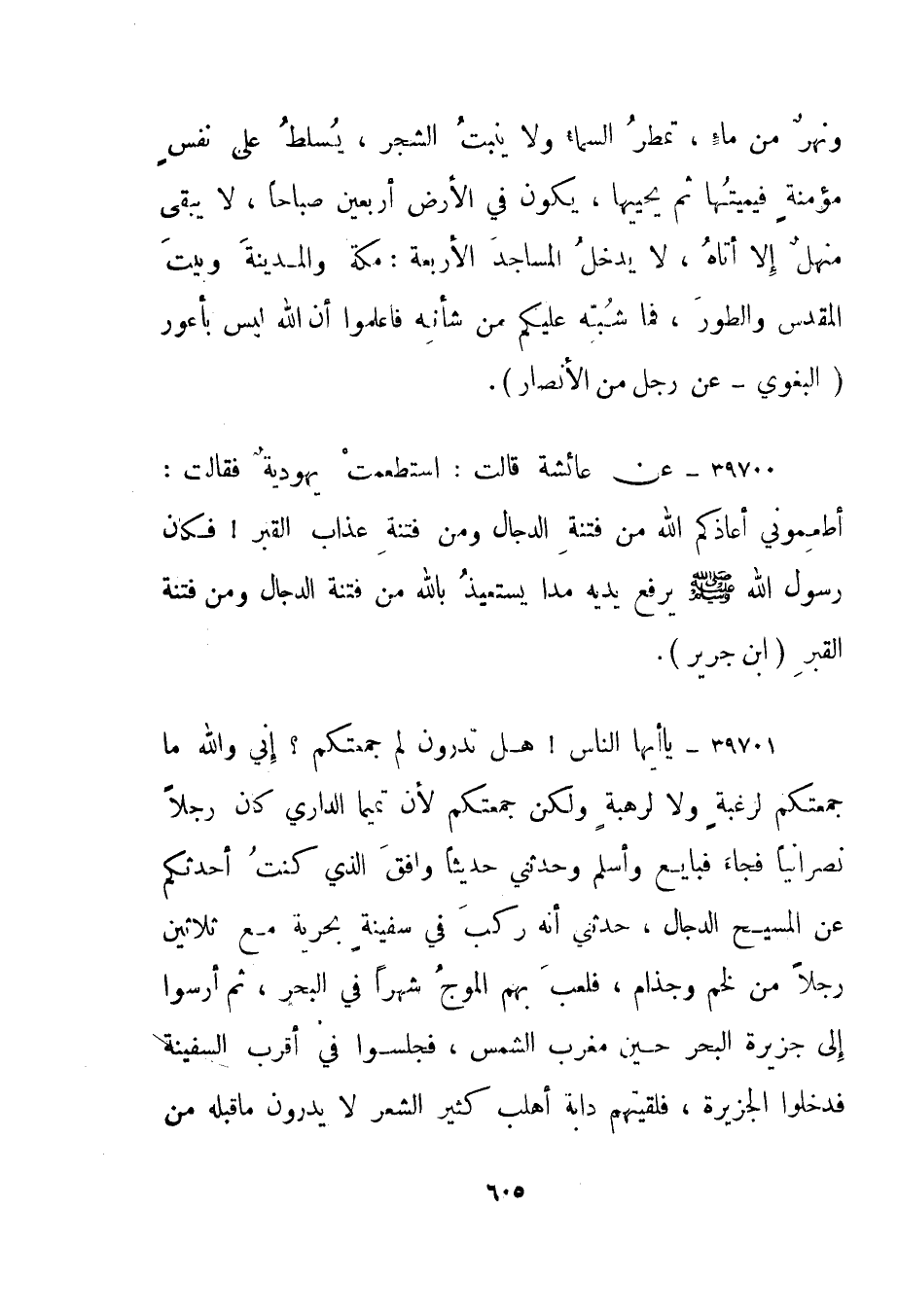 39701- "يا أيها الناس! هل تدرون لم جمعتكم؟ إني والله ما جمعتكم لرغبة ولا لرهبة ولكن جمعتكم لأن تميما الداري كان رجلا نصرانيا فجاء فبايع وأسلم وحدثني حديثا وافق الذي كنت أحدثكم عن المسيح الدجال، حدثني أنه ركب في سفينة بحرية مع ثلاثين رجلا من لخم وجذام، فلعب بهم الموج شهرا في البحر، ثم أرسوا إلى جزيرة البحر حين مغرب الشمس، فجلسوا في أقرب السفينة فدخلوا الجزيرة، فلقيتهم دابة أهلب كثير الشعر لا يدرون ما قبله من