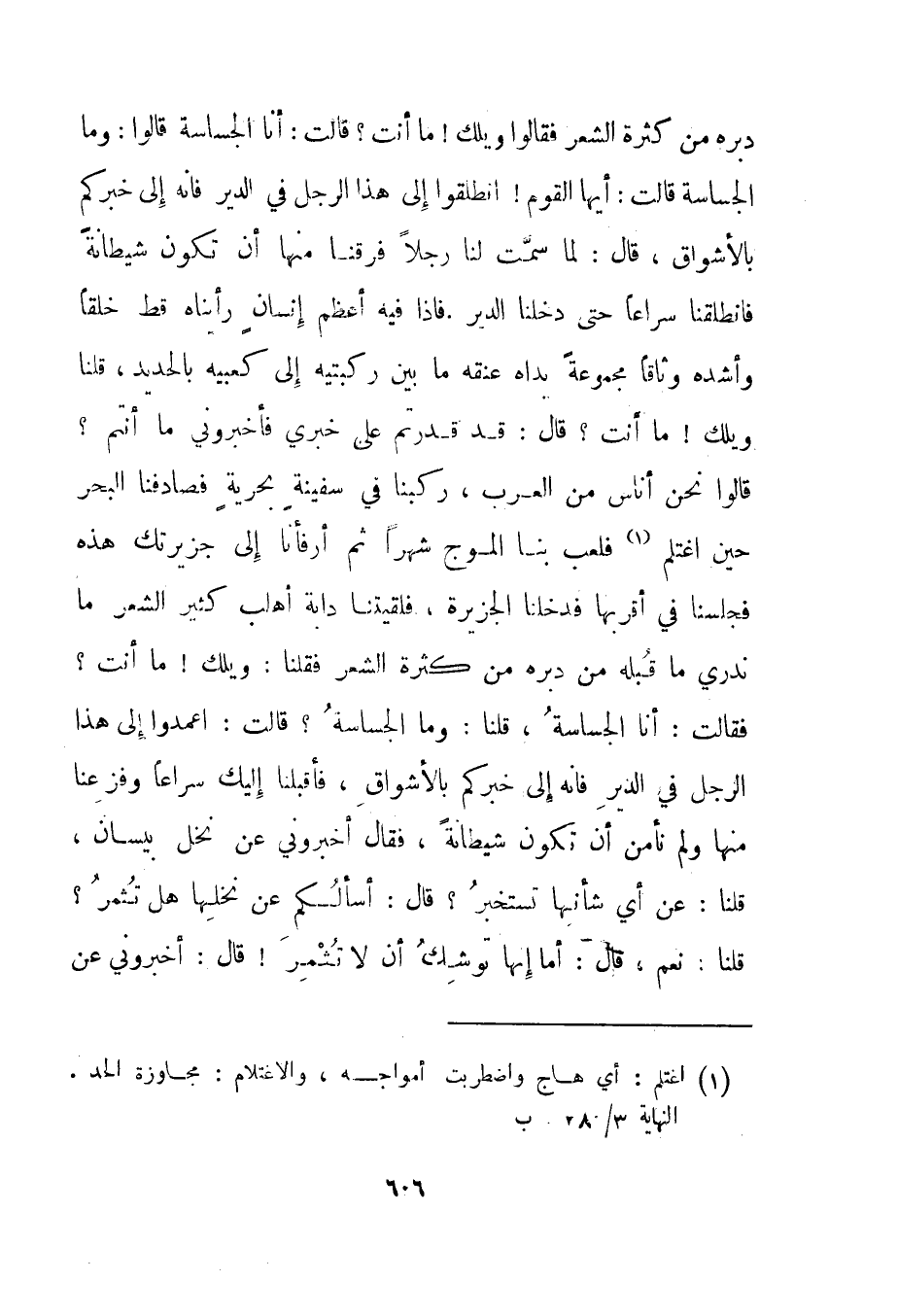 دبره من كثرة الشعر فقالوا ويلك! ما أنت؟ قالت: أنا الجساسة قالوا: وما الجساسة قالت: أيها القوم! انطلقوا إلى هذا الرجل في الدير فإنه إلى خبركم بالأشواق، قال: لما سمت لنا رجلا فرقنا منها أن تكون شيطانة فانطلقنا سراعا حتى دخلنا الدير، فإذا فيه أعظم إنسان رأيناه قط خلقا وأشده وثاقا مجموعة يداه عنقه ما بين ركبتيه إلى كعبيه بالحديد، قلنا ويلك! ما أنت؟ قال: قد قدرتم على خبري فأخبروني ما أنتم؟ قالوا نحن أناس من العرب، ركبنا في سفينة بحرية فصادفنا البحر حين اغتلم1 فلعب بنا الموج شهرا ثم أرفأنا إلى جزيرتك هذه فجلسنا في أقربها فدخلنا الجزيرة، فلقيتنا دابة أهلب كثير الشعر ما ندري ما قبله من دبره من كثرة الشعر فقلنا: ويلك! ما أنت؟ فقالت: أنا الجساسة، قلنا: وما الجساسة؟ قالت: اعمدوا إلى هذا الرجل في الدير فإنه إلى خبركم بالأشواق، فأقبلنا إليك سراعا وفزعنا منها ولم نأمن أن تكون شيطانة، فقال أخبروني عن نخل بيسان، قلنا: عن أي شأنها تستخبر؟ قال: أسألكم عن نخلها هل تثمر؟ قلنا: نعم، قال: أما إنها توشك أن لا تثمر! قال: أخبروني عن