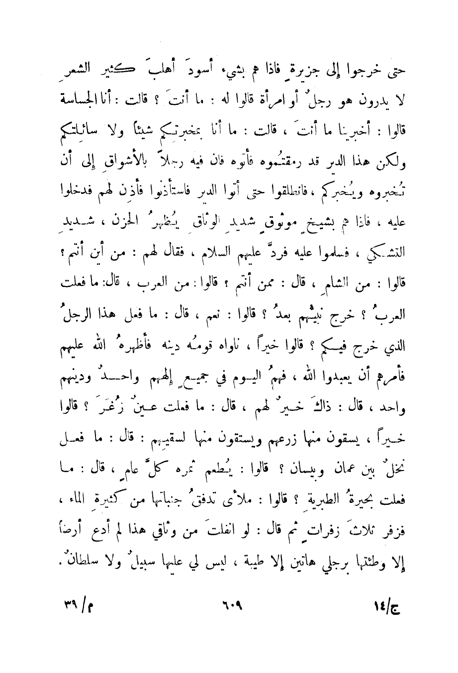 حتى خرجوا إلى جزيرة فإذا هم بشيء أسود أهلب كثير الشعر لا يدرون هو رجل أو امرأة قالوا له: ما أنت؟ قالت: أنا الجساسة قالوا: أخبرينا ما أنت، قالت: ما أنا بمخبرتكم شيئا ولا سائلتكم ولكن هذا الدير قد رمقتموه فأتوه فإن فيه رجلا بالأشواق إلى أن تخبروه ويخبركم، فانطلقوا حتى أتوا الدير فاستأذنوا فأذن لهم فدخلوا عليه، فإذا هم بشيخ موثوق شديد الوثاق يظهر الحزن، شديد التشكي فسلموا عليه فرد عليهم السلام، فقال لهم: من أين أنتم؟ قالوا: من الشام، قال: ممن أنتم؟ قالوا: من العرب، قال: ما فعلت العرب؟ خرج نبيهم بعد؟ قالوا: نعم، قال: ما فعل هذا الرجل الذي خرج فيكم؟ قالوا خيرا، ناواه قومه دينه فأظهره الله عليهم فأمرهم أن يعبدوا الله، فهم اليوم في جميع إلههم واحد ودينهم واحد، قال: ذاك خير لهم، قال: ما فعلت عين زغر؟ قالوا خيرا، يسقون منها زرعهم ويستقون منها لسقيهم: قال: ما فعل نخل بين عمان وبيسان؟ قالوا: يطعم ثمره كل عام، قال: ما فعلت بحيرة الطبرية؟ قالوا: ملأى تدفق جنباتها من كثيرة الماء، فزفر ثلاث زفرات ثم قال: لو انفلت من وثاقي هذا لم أدع أضا إلا وطئتها برجلي هاتين إلا طيبة، ليس لي عليها سبيل ولا سلطان،
