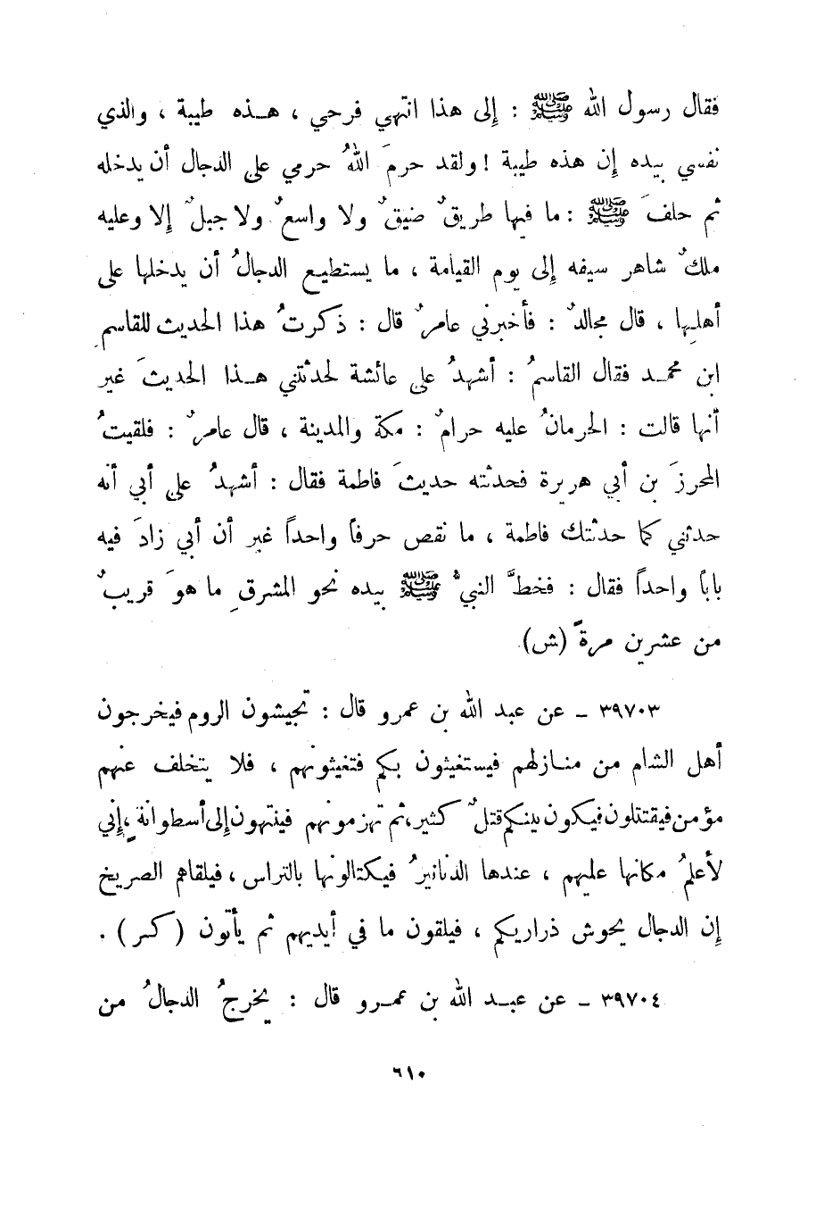 فقال رسول الله صلى الله عليه وسلم: إلى هذا انتهي فرحي، هذه طيبة، والذي نفسي بيده إن هذه طيبة! ولقد حرم الله حرمي على الدجال أن يدخله ثم حلف صلى الله عليه وسلم: ما فيها طريق ضيق ولا واسع ولا جبل إلا وعليه ملك شاهر سيفه إلى يوم القيامة، ما يستطيع الدجال أن يدخلها على أهلها،" قال مجالد: فأخبرني عامر قال: ذكرت هذا الحديث للقاسم ابن محمد فقال القاسم: أشهد على عائشة لحدثتني هذا الحديث غير أنها قالت: الحرمان عليه حرام: مكة والمدينة، قال عامر: فلقيت المحرز بن أبي هريرة فحدثته حديث فاطمة فقال: أشهد على أبي أنه حدثني كما حدثتك فاطمة، ما نقص حرفا واحدا غير أن أبي زاد فيه بابا واحدا فقال: "فخط النبي صلى الله عليه وسلم بيده نحو المشرق ما هو قريب من عشرين مرة." ش".
