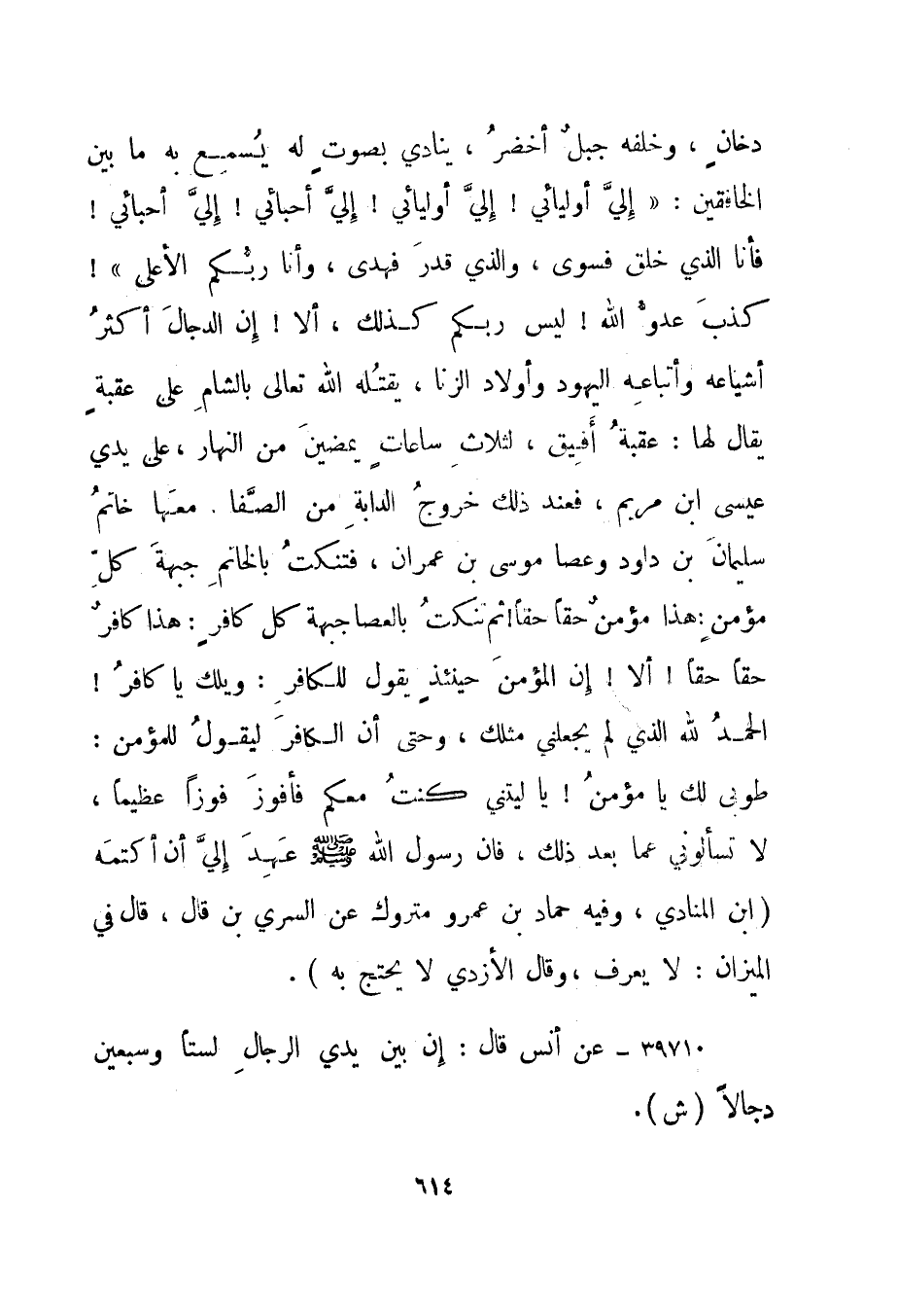 دخان، وخلفه جبل أخضر، ينادي بصوت له يسمع به ما بين الخافقين: "إلي أوليائي! إلي أوليائي! إلي أحبائي! إلي أحبائي! فأنا الذي خلق فسوى، والذي قدر فهدى، وأنا ربكم الأعلى"! كذب عدو الله! ليس ربكم كذلك، ألا! إن الدجال أكثر أشياعه وأتباعه اليهود وأولاد الزنا، يقتله الله تعالى بالشام على عقبة يقال لها: عقبة أفيق، لثلاث ساعات يمضين من النهار، على يدي عيسى ابن مريم، فعند ذلك خروج الدابة من الصفا، معها خاتم سليمان بن داود وعصا موسى بن عمران، فتنكت بالخاتم جبهة كل مؤمن: هذا مؤمن حقا حقا! ثم تنكت بالعصا جبهة كل كافر: هذا كافر حقا حقا! ألا! إن المؤمن حينئذ يقول للكافر: ويلك يا كافر! الحمد لله الذي لم يجعلني مثلك، وحتى أن الكافر ليقول للمؤمن: طوبى لك يا مؤمن! يا ليتني كنت معكم فأفوز فوزا عظيما، لا تسألوني عما بعد ذلك، فإن رسول الله صلى الله عليه وسلم عهد إلي أن أكتمه."ابن المنادي، وفيه حماد بن عمرو متروك عن السري بن قال، قال في الميزان: لا يعرف، وقال الأزدي لا يحتج به".