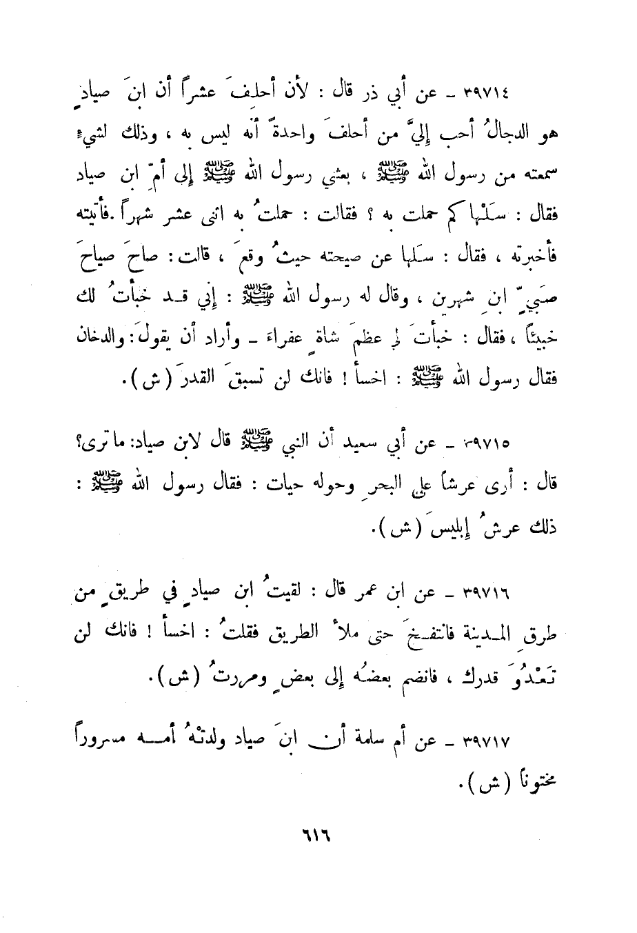 39717- عن أم سلمة أن ابن صياد ولدته أمه مسرورا مختونا. "ش".