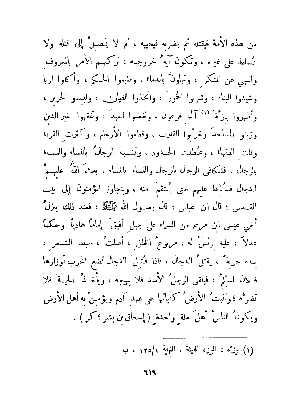 من هذه الأمة فيقتله ثم يضربه فيحييه، ثم لا يصل إلى قتله ولا يسلط على غيره، وتكون آية خروجه: تركهم الأمر بالمعروف والنهي عن المنكر، وتهاون بالدماء، وضيعوا الحكم، وأكلوا الربا وشيدوا البناء، وشربوا الخمور، واتخذوا القيان، ولبسوا الحرير، وأظهروا بزة1 آل فرعون، ونقضوا العهد، وتفقهوا لغير الدين وزينوا المساجد وخربوا القلوب، وقطعوا الأرحام، وكثرت القراء وقلت الفقهاء، وعطلت الحدود، وتشبه الرجال بالنساء والنساء بالرجال، فتكافى الرجال بالرجال والنساء بالنساء، بعث الله عليهم الدجال فسلط عليهم حتى ينتقم منه، وبتجاوز المؤمنون إلى بيت المقدس؛" قال ابن عباس: قال رسول الله صلى الله عليه وسلم: "فعند ذلك ينزل أخي عيسى ابن مريم من السماء على جبل أفيق إماما هاديا وحكما عدلا، عليه برنس له، مربوع الخلق، أصلت، سبط الشعر، بيده حربة، يقتل الدجال، فإذا قتل الدجال تضع الحرب أوزارها فكان السلم، فيلقى الرجل الأسد فلا يهيجه، ويأخذ الحية فلا تضره؛ وتنبت الأرض كنباتها على عهد آدم ويؤمن به أهل الأرض ويكون الناس أهل ملة واحدة." إسحاق بن بشر؛ كر".