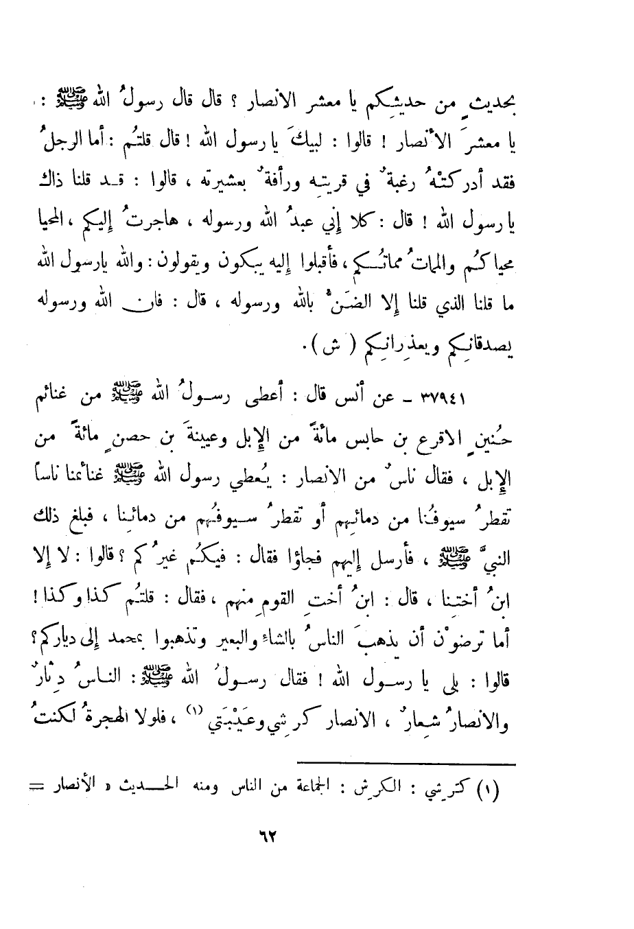 37941- عن أنس قال: أعطى رسول الله صلى الله عليه وسلم من غنائم حنين الأقرع بن حابس مائة من الإبل وعيينة بن حصن مائة من الإبل، فقال ناس من الأنصار: يعطي رسول الله صلى الله عليه وسلم غنائمنا ناسا تقطر سيوفنا من دمائهم أو تقطر سيوفهم من دمائنا، فبلغ ذلك النبي صلى الله عليه وسلم، فأرسل إليهم فجاؤا فقال: "فيكم غيركم؟ " قالوا: لا إلا ابن أختنا، قال: " ابن أخت القوم منهم"، فقال: "قلتم كذا وكذا! أما ترضون أن يذهب الناس بالشاء والبعير وتذهبوا بمحمد إلى دياركم؟ " قالوا: بلى يا رسول الله! فقال رسول الله صلى الله عليه وسلم: "الناس دثار والأنصار شعار، الأنصار كرشي وعيبتي1، فلولا الهجرة لكنت