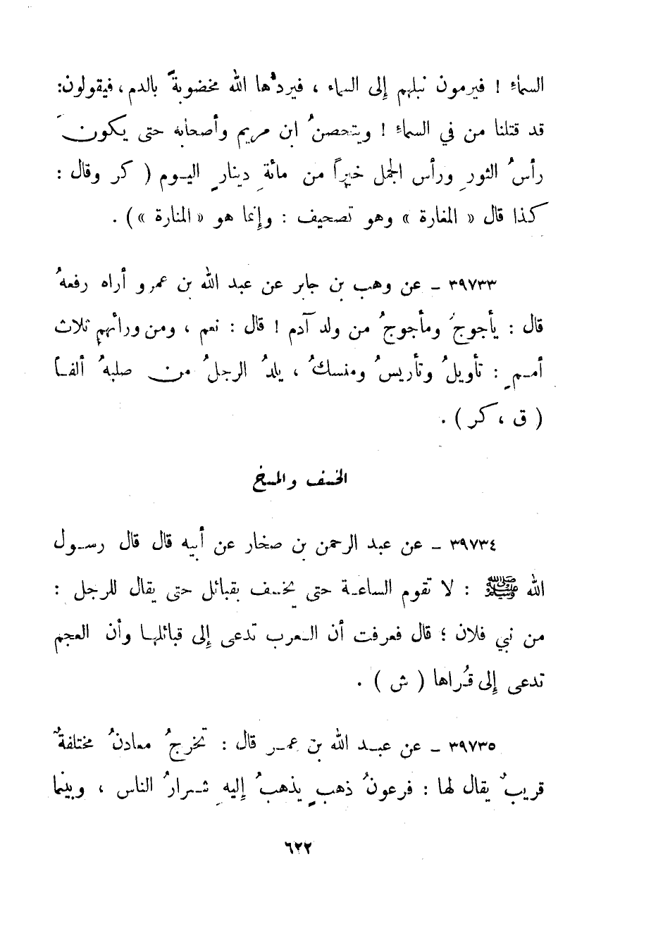 39734- عن عبد الرحمن بن صخار عن أبيه قال قال رسول الله صلى الله عليه وسلم: "لا تقوم الساعة حتى يخسف بقبائل حتى يقال للرجل: من نبي فلان؛ قال فعرفت أن العرب تدعى إلى قبائلها وأن العجم تدعى إلى قراها." ش".