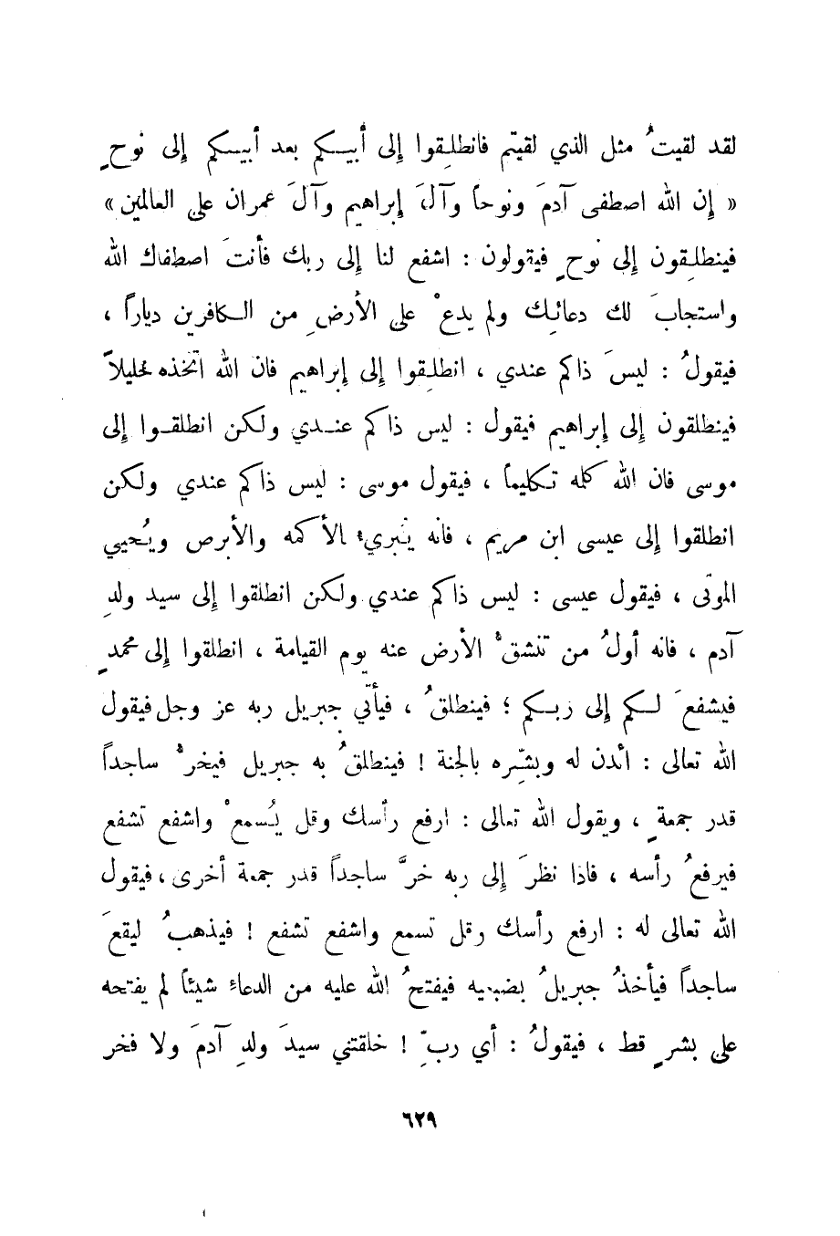 لقد لقيت مثل الذي لقيتم فانطلقوا إلى أبيكم بعد أبيكم إلى نوح {إن الله اصطفى آدم ونوحا وآل إبراهيم وآل عمران على العالمين} فينطلقون إلى نوح فيقولون: اشفع لنا إلى ربك فأنت اصطفاك الله واستجاب لك دعائك ولم يدع على الأرض من الكافرين ديارا، فيقول: ليس ذاكم عندي، انطلقوا إلى إبراهيم فإن الله اتخذه خليلا فينطلقون إلى إبراهيم فيقول: ليس ذاكم عندي ولكن انطلقوا إلى موسى فإن الله كلمه تكليما، فيقول موسى: ليس ذاكم عندي ولكن انطلقوا إلى عيسى ابن مريم، فإنه يبريء الأكمه والأبرص ويحيي الموتى، فيقول عيسى: ليس ذاكم عندي ولكن انطلقوا إلى سيد ولد آدم، فإنه أول من تنشق الأرض عنه يوم القيامة، انطلقوا إلى محمد فيشفع لكم إلى ربكم فينطلق، فيأتي جبريل ربه عز وجل فيقول الله تعالى: ائذن له وبشره بالجنة! فينطلق به جبريل فيخر ساجدا قدر جمعة، ويقول الله تعالى: ارفع رأسك وقل يسمع واشفع تشفع فيرفع رأسه، فإذا نظر إلى ربه خر ساجدا قدر جمعة أخرى، فيقول الله تعالى له: ارفع رأسك وقل تسمع واشفع تشفع! فيذهب ليقع ساجدا فيأخذ جبريل بضبعيه فيفتح الله عليه من الدعاء شيئا لم يفتحه على بشر قط، فيقول: أي رب! خلقتني سيد ولد آدم ولا فخر