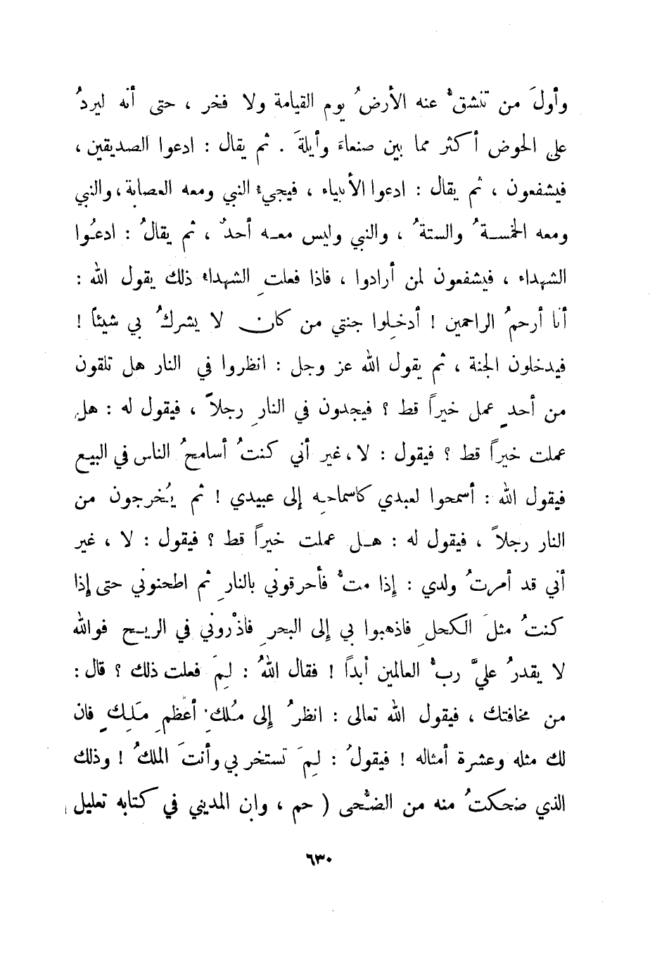 وأول من تنشق عنه الأرض يوم القيامة ولا فخر، حتى أنه ليرد على الحوض أكثر مما بين صنعاء وأيلة، ثم يقال: ادعوا الصديقين، فيشفعون، ثم يقال: ادعوا الأنبياء، فيجيء النبي ومعه العصابة، والنبي ومعه الخمسة والستة، والنبي وليس معه أحد، ثم يقال: ادعوا الشهداء، فيشفعون لمن أرادوا، فإذا فعلت الشهداء ذلك يقول الله: أنا أرحم الراحمين! أدخلوا جنتي من كان لا يشرك بي شيئا! فيدخلون الجنة، ثم يقول الله عز وجل: انظروا في النار هل تلقون من أحد عمل خيرا قط؟ فيجدون في النار رجلا، فيقول له: هل عملت خيرا قط؟ فيقول: لا، غير أني كنت أسامح الناس في البيع فيقول الله: أسمحوا لعبدي كاسماحه إلى عبيدي! ثم يخرجون من النار رجلا، فيقول له: هل عملت خيرا قط؟ فيقول: لا، غير أني قد أمرت ولدي: إذا مت فأحرقوني بالنار ثم اطحنوني حتى إذا كنت مثل الكحل فاذهبوا بي إلى البحر فاذروني في الريح فوالله لا يقدر علي رب العالمين أبدا! فقال الله: لم فعلت ذلك؟ قال: من مخافتك، فيقول الله تعالى: انظر إلى ملك أعظم ملك فإن لك مثله وعشرة أمثاله! فيقول: لم تستخر بي وأنت الملك! وذلك الذي ضحكت منه من الضحى." حم، وابن المديني في كتابه تعليل