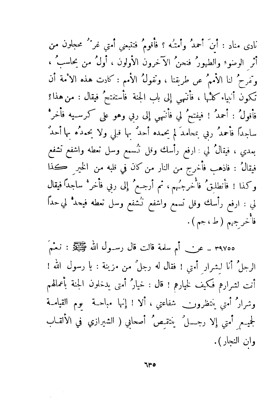 نادى مناد: أين أحمد وأمته؟ فأقوم فتتبعني أمتي غر محجلون من أثر الوضوء والطهور فنحن الآخرون الأولون، أول من يحاسب، وتفرح لنا الأمم عن طريقنا، وتقول الأمم: كادت هذه الأمة أن تكون أنبياء كلها، فأنتهي إلى باب الجنة فأستفتح فيقال: من هذا؟ فأقول: أحمد! فيفتح لي فأنتهي إلى ربي وهو على كرسيه فأخر ساجدا فأحمد ربي بمحامد لم يحمده أحد بها قبلي ولا يحمده بها أحد بعدي، فيقال لي: ارفع رأسك وقل تسمع وسل تعطه واشفع تشفع فيقال: فاذهب فأخرج من النار من كان في قلبه من الخير كذا وكذا! فأنطلق فأخرجهم، ثم أرجع إلى ربي فأخر ساجدا فيقال لي: ارفع رأسك وقل تسمع واشفع تشفع وسل تعطه فيحد لي حدا فأخرجهم." ط، حم".