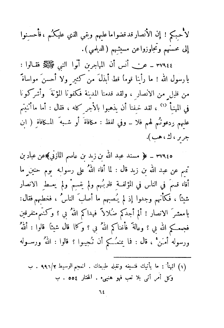 37945- "مسند عبد الله بن زيد بن عاصم المازني" عن عباد بن تميم عن عبد الله بن زيد قال: لما أفاء الله على رسوله يوم حنين ما أفاء قسم في الناس في المؤلفة قلوبهم ولم يقسم ولم يعط الأنصار شيئا، فكأنهم وجدوا إذ لم يصبهم ما أصاب الناس، فخطبهم فقال: "يا معشر الأنصار! ألم أجدكم ضلالا فهداكم الله بي؟ وكنتم متفرقين فجمعكم الله بي؟ وعالة فأغناكم الله بي؟ " وكلما قال شيئا قالوا: الله ورسوله أمن، قال: "فما يمنعكم أن تجيبوا؟ " قالوا: الله ورسوله