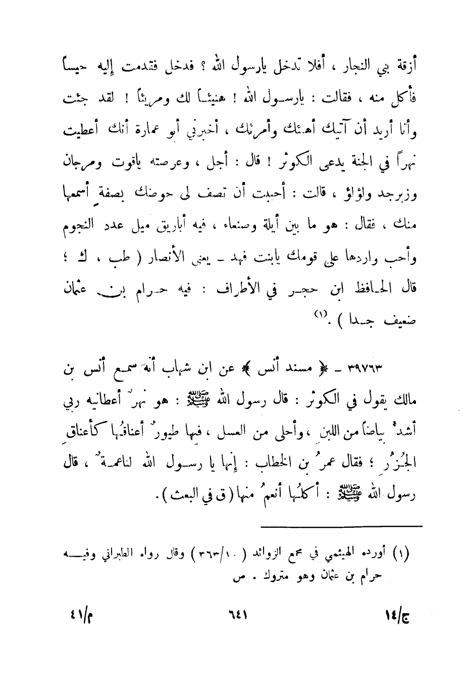 أزقة بني النجار، أفلا تدخل يا رسول الله؟ فدخل فقدمت إليه حيسا فأكل منه، فقالت: يا رسول الله! هنيئا لك ومريئا! لقد جئت وأنا أريد أن آتيك أهنئك وأمرئك، أخبرني أبو عمارة أنك أعطيت نهرا في الجنة يدعى الكوثر! قال: أجل، وعرصته ياقوت ومرجان وزبرجد ولؤلؤ، قالت: أحببت أن تصف لي حوضك بصفة أسمعها منك، فقال: هو ما بين أيلة وصنعاء، فيه أباريق ميل عدد النجوم وأحب واردها على قومك يا بنت فهد - يعني الأنصار." طب، ك؛ قال الحافظ ابن حجر في الأطراف: فيه حرام بن عثمان ضعيف جدا" 1