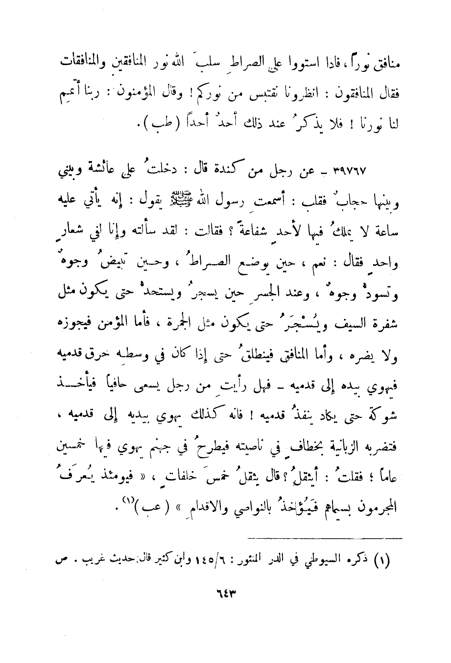 39767- عن رجل من كندة قال: دخلت على عائشة وبيني وبينها حجاب فقلت: أسمعت رسول الله صلى الله عليه وسلم يقول: إنه يأتي عليه ساعة لا يملك فيها لأحد شفاعة؟ فقالت: لقد سألته وإنا لفي شعار واحد فقال: "نعم، حين يوضع الصراط، وحين تبيض وجوه وتسود وجوه، وعند الجسر حين يسجر ويستحد حتى يكون مثل شفرة السيف ويسجر حتى يكون مثل الجمرة، فأما المؤمن فيجوزه ولا يضره، وأما المنافق فينطلق حتى إذا كان في وسطه حرق قدميه فيهوي بيده إلى قدميه - فهل رأيت من رجل يسعى حافيا فيأخذ شوكة حتى يكاد ينفذ قدميه! فإنه كذلك يهوي بيديه إلى قدميه، فتضربه الزبانية بخطاف في ناصيته فيطرح في جهنم يهوي فيها خمسين عاما؛ فقلت: أيثقل؟ قال يثقل خمس خلفات، {فيومئذ يعرف المجرمون بسيماهم فيؤخذ بالنواصي والأقدام} . "عب"