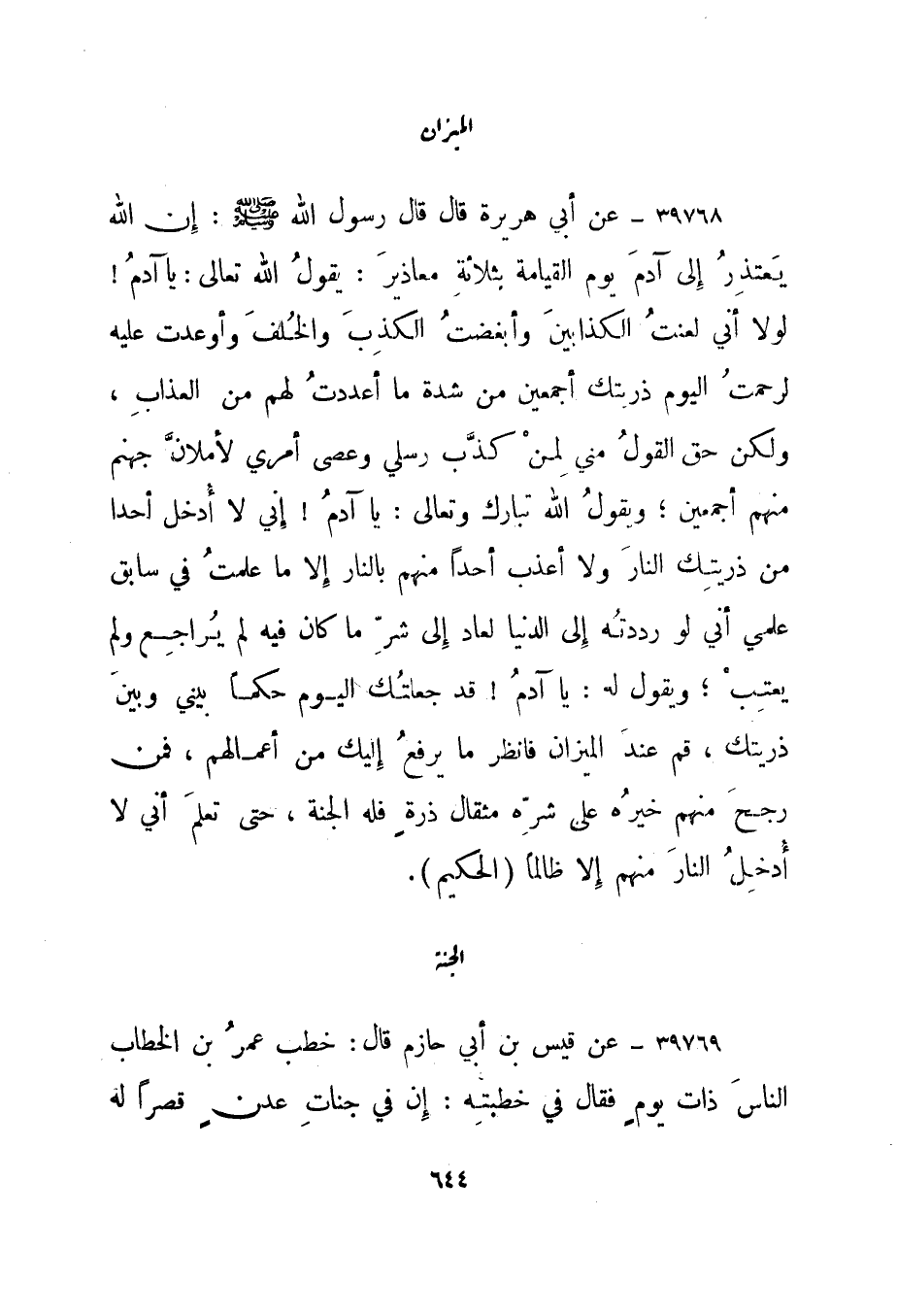 39768- عن أبي هريرة قال قال رسول الله صلى الله عليه وسلم: " إن الله يعتذر إلى آدم يوم القيامة بثلاثة معاذير: يقول الله تعالى: يا آدم! لولا أني لعنت الكذابين وأبغضت الكذب والخلف وأوعدت عليه لرحمت اليوم ذريتك أجمعين من شدة ما أعددت لهم من العذاب، ولكن حق القول مني لمن كذب رسلي وعصى أمري لأملأن جهنم منهم أجمعين؛ ويقول الله تبارك وتعالى: يا آدم! إني لا أدخل أحدا من ذريتك النار ولا أعذب أحدا منهم بالنار إلا ما علمت في سابق علمي أني لو رددته إلى الدنيا لعاد إلى شر ما كان فيه لم يراجع ولم يعتب؛ ويقول له: يا آدم! قد جعلتك اليوم حكما بيني وبين ذريتك، قم عند الميزان فانظر ما يرفع إليك من أعمالهم، فمن رجح منهم خيره على شره مثقال ذرة فله الجنة، حتى تعلم أني لا أدخل النار منهم إلا ظالما." الحكيم".