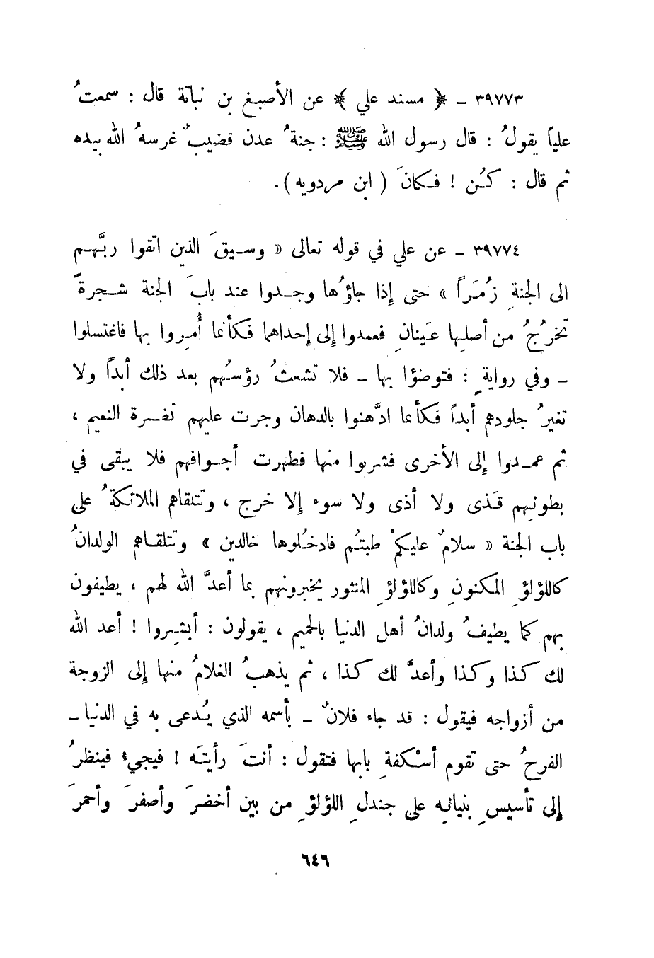 39774- عن علي في قوله تعالى {وَسِيقَ الَّذِينَ اتَّقَوْا رَبَّهُمْ إِلَى الْجَنَّةِ زُمَراً} حتى إذا جاؤها وجدوا عند باب الجنة شجرة تخرج من أصلها عينان فعمدوا إلى إحداهما فكأنما أمروا بها فاغتسلوا - وفي رواية: فتوضؤا بها - فلا تشعث رؤسهم بعد ذلك أبدا ولا تغير جلودهم أبدا فكأنما ادهنوا بالدهان وجرت عليهم نضرة النعيم، ثم عمدوا إلى الأخرى فشربوا منها فطهرت أجوافهم فلا يبقى في بطونهم قذى ولا أذى ولا سوء إلا خرج، وتتلقاهم الملائكة على باب الجنة {سَلامٌ عَلَيْكُمْ طِبْتُمْ فَادْخُلُوهَا خَالِدِينَ} وتتلقاهم الولدان كاللؤلؤ المنثور يخبرونهم بما أعد الله لهم، يطيفون بهم كما يطيف ولدان أهل الدنيا بالحميم، يقولون: أبشروا! أعد الله لك كذا وكذا وأعد لك كذا، ثم يذهب الغلام منها إلى الزوجة من أزواجه فيقول: قد جاء فلان - بأسمه الذي يدعى به في الدنيا - الفرح حتى تقوم أسكفة بابها فتقول: أنت رأيته! فيجيء فينظر إلى تأسيس بنيانه على جندل اللؤلؤ من بين أخضر وأصفر وأحمر