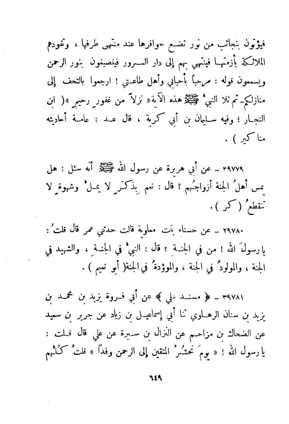 39779- عن أبي هريرة عن رسول الله صلى الله عليه وسلم أنه سئل: "هل يمس أهل الجنة أزواجهم؟ قال: نعم بذكر لا يمل وشهوة لا تنقطع". كر".