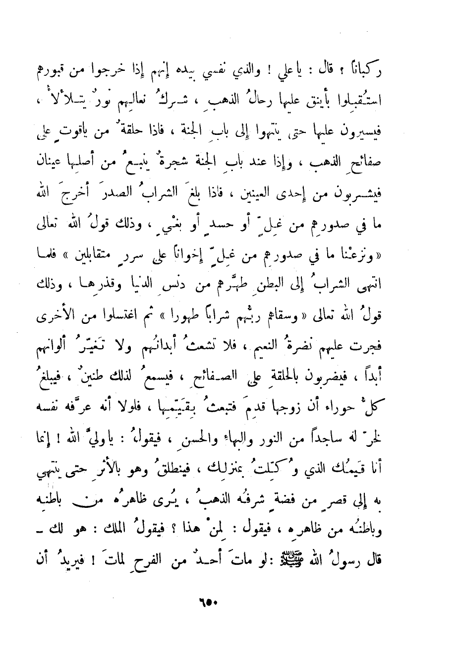 ركبانا؟ قال: "يا علي! والذي نفسي بيده إنهم إذا خرجوا من قبورهم استقبلوا بأينق عليها رحال الذهب، شرك نعالهم نور يتلألأ، فيسيرون عليها حتى ينتهوا إلى باب الجنة، فإذا حلقة من ياقوت على صفائح الذهب، وإذا عند باب الجنة شجرة ينبع من أصلها عينان فيشربون من إحدى العينين، فإذا بلغ الشراب الصدر أخرج الله ما في صدورهم من غل أو حسد أو بغي، وذلك قول الله تعالى {وَنَزَعْنَا مَا فِي صُدُورِهِمْ مِنْ غِلٍّ إِخْوَاناً عَلَى سُرُرٍ مُتَقَابِلِينَ} فلما انتهى الشراب إلى البطن طهرهم من دنس الدنيا وقذرها، وذلك قول الله تعالى {وَسَقَاهُمْ رَبُّهُمْ شَرَاباً طَهُوراً} ثم اغتسلوا من الأخرى فجرت عليهم نضرة النعيم، فلا تشعث أبدانهم ولا تغير ألوانهم أبدا، فيضربون بالحلقة على الصفائح، فيسمع لذلك طنين، فيبلغ كل حوراء أن زوجها قدم فتبعث بقيمها، فلولا أنه عرفه نفسه لخر له ساجدا من النور والبهاء والحسن، فيقول: يا ولي الله! إنما أنا قيمك الذي وكلت بمنزلك. فينطلق وهو بالأثر حتى ينتهي به إلى قصر من فضة شرفه الذهب، يرى ظاهره من باطنه وباطنه من ظاهره، فيقول: لمن هذا؟ فيقول الملك: هو لك - قال رسول الله صلى الله عليه وسلم: لو مات أحد من الفرح لمات! فيريد أن