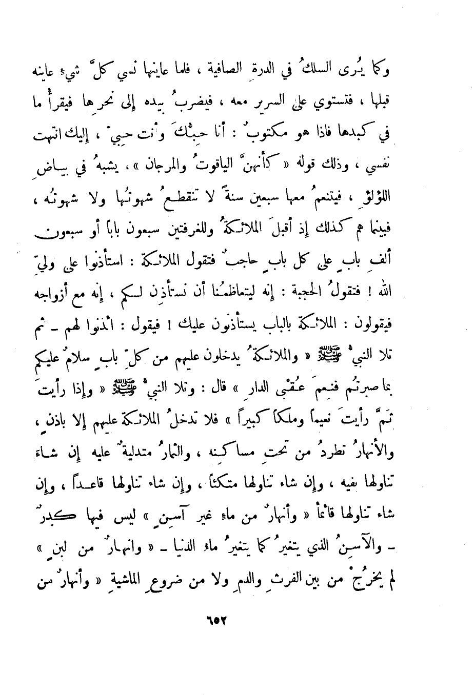 وكما يرى السلك في الدرة الصافية، فلما عاينها نسي كل شيء عاينه قبلها، فتستوي على السرير معه، فيضرب بيده إلى نحرها فيقرأ ما في كبدها فإذا هو مكتوب: أنا حبك وأنت حبي، إليك انتهت نفسي، وذلك قوله {كَأَنَّهُنَّ الْيَاقُوتُ وَالْمَرْجَانُ} ، يشبه في بياض اللؤلؤ، فيتنعم معها سبعين سنة لا تنقطع شهوتها ولا شهوته، فبينما هم كذلك إذ أقبل الملائكة وللغرفتين سبعون بابا أو سبعون ألف باب على كل باب حاجب فتقول الملائكة: استأذنوا على ولي الله! فتقول الحجبة: إنه ليتعاظمنا أن نستأذن لكم، إنه مع أزواجه فيقولون: الملائكة بالباب يستأذنون عليك! فيقول: ائذنوا لهم - ثم تلا النبي صلى الله عليه وسلم {وَالْمَلائِكَةُ يَدْخُلُونَ عَلَيْهِمْ مِنْ كُلِّ بَابٍ سَلامٌ عَلَيْكُمْ بِمَا صَبَرْتُمْ فَنِعْمَ عُقْبَى الدَّارِ} قال: وتلا النبي صلى الله عليه وسلم {وَإِذَا رَأَيْتَ ثَمَّ رَأَيْتَ نَعِيماً وَمُلْكاً كَبِيراً} فلا تدخل الملائكة عليهم إلا بإذن، والأنهار تطرد من تحت مساكنه، والثمار متدلية عليه إن شاء تناولها بفيه، وإن شاء تناولها متكئا، وإن شاء تناولها قاعدا، وإن شاء تناولها قائما {أَنْهَارٌ مِنْ مَاءٍ غَيْرِ آسِنٍ} ليس فيها كدر - والآسن الذي يتغير كما يتغير ماء الدنيا – {وَأَنْهَارٌ مِنْ لَبَنٍ} لم يخرج من بين الفرث والدم ولا من ضروع الماشية {وَأَنْهَارٌ مِنْ