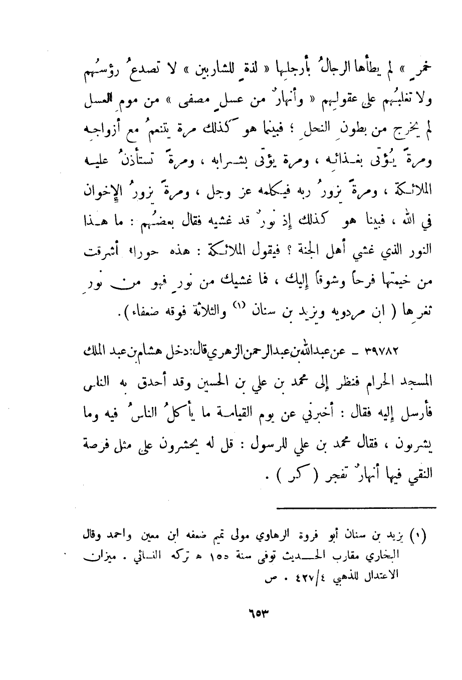 39782- عن عبد الله بن عبد الرحمن الزهري قال: دخل هشام بن عبد الملك المسجد الحرام فنظر إلى محمد بن علي بن الحسين وقد أحدق به الناس فأرسل إليه فقال: أخبرني عن يوم القيامة ما يأكل الناس فيه وما يشربون، فقال محمد بن علي للرسول: قل له يحشرون على مثل فرصة النقي فيها أنهار تفجر."كر".