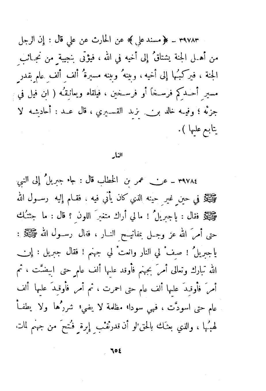 39784- عن عمر بن الخطاب قال: جاء جبريل إلى النبي صلى الله عليه وسلم في حين غير حينه الذي كان يأتي فيه، فقام إليه رسول الله صلى الله عليه وسلم فقال: "يا جبريل! ما لي أراك متغير اللون؟ قال: ما جئتك حتى أمر الله عز وجل بمفاتيح النار، فقال رسول الله صلى الله عليه وسلم: يا جبريل! صف لي النار وانعت لي جهنم! فقال جبريل: إن الله تبارك وتعالى أمر بجهنم فأوقد عليها ألف عام حتى ابيضت، ثم أمر فأوقد عليها ألف عام حتى احمرت، ثم أمر فأوقد عليها ألف عام حتى اسودت، فهي سوداء مظلمة لا يضيء شررها ولا يطفأ لهبها، والذي بعثك بالحق لو أن قدر ثقب إبرة فتح من جهنم لمات