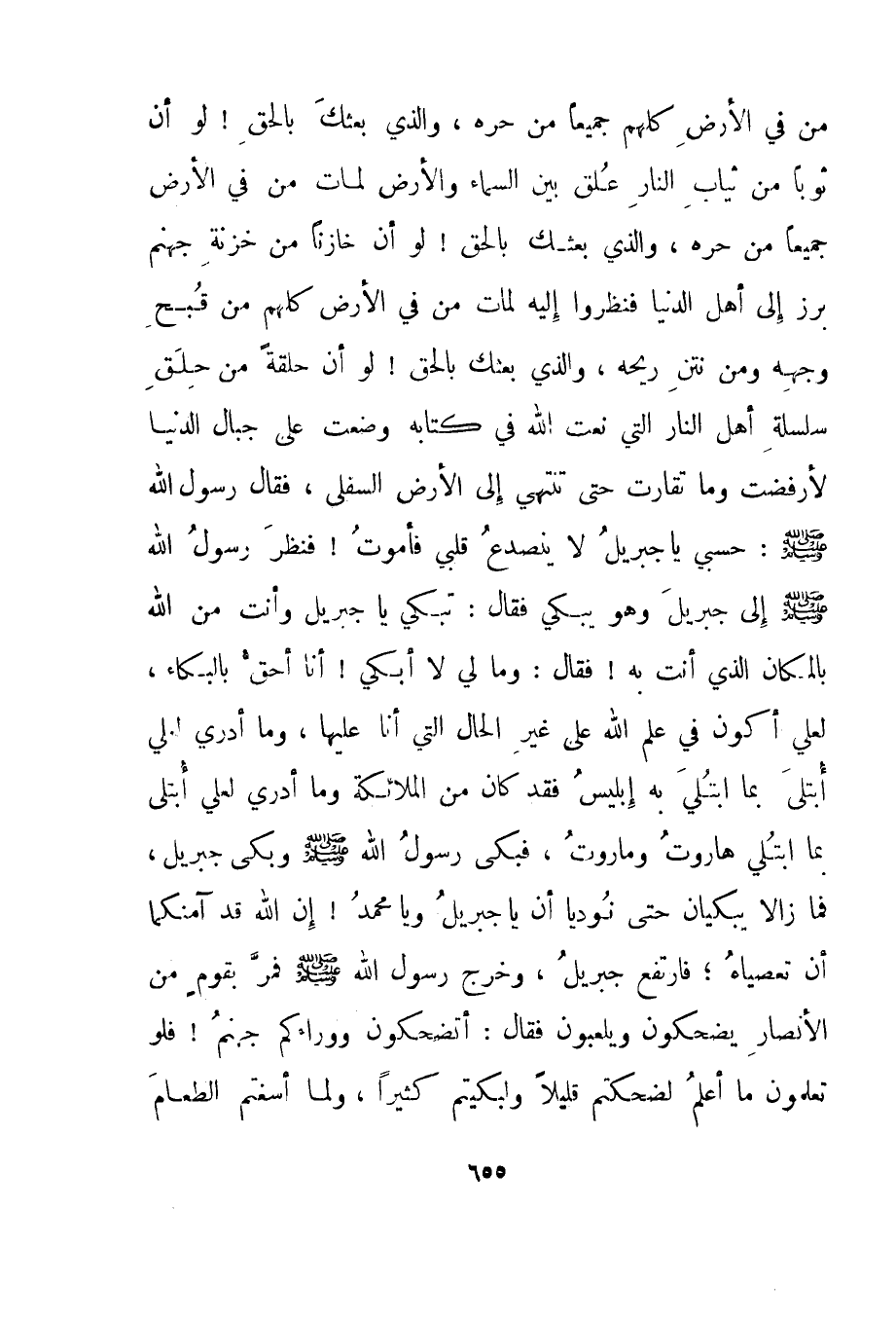 من في الأرض كلهم جميعا من حره، والذي بعثك بالحق! لو أن ثوبا من ثياب النار علق بين السماء والأرض لمات من في الأرض جميعا من حره، والذي بعثك بالحق! لو أن خازنا من خزنة جهنم برز إلى أهل الدنيا فنظروا إليه لمات من في الأرض كلهم من قبح وجهه ومن نتن ريحه، والذي بعثك بالحق! لو أن حلقة من حلق سلسلة أهل النار التي نعت الله في كتابه وضعت على جبال الدنيا لأرفضت وما تقارت حتى تنتهي إلى الأرض السفلى، فقال رسول الله صلى الله عليه وسلم: حسبي يا جبريل لا ينصدع قلبي فأموت! فنظر رسول الله صلى الله عليه وسلم إلى جبريل وهو يبكي فقال: تبكي يا جبريل وأنت من الله بالمكان الذي أنت به! فقال: وما لي لا أبكي! أنا أحق بالبكاء، لعلي أكون في علم الله على غير الحال التي أنا عليها، وما أدري لعلي أبتلى بما ابتلي به إبليس فقد كان من الملائكة وما أدري لعلي أبتلى بما ابتلي هاروت وماروت، فبكى رسول الله صلى الله عليه وسلم وبكى جبريل، فما زالا يبكيان حتى نوديا أن يا جبريل ويا محمد! إن الله قد آمنكما أن تعصياه؛ فارتفع جبريل، وخرج رسول الله صلى الله عليه وسلم فمر بقوم من الأنصار يضحكون ويلعبون فقال: أتضحكون ووراءكم جهنم! فلو تعلمون ما أعلم لضحكتم قليلا ولبكيتم كثيرا، ولما أسغتم الطعام