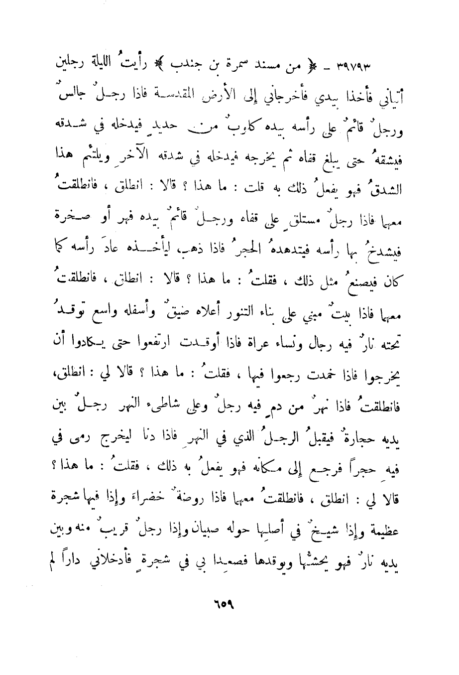 39793- "من مسند سمرة بن جندب "رأيت الليلة رجلين أتياني فأخذا بيدي فأخرجاني إلى الأرض المقدسة فإذا رجل جالس ورجل قائم على رأسه بيده كلوب من حديد فيدخله في شدقه فيشقه حتى يبلغ قفاه ثم يخرجه فيدخله في شدقه الآخر ويلتئم هذا الشدق فهو يفعل ذلك به قلت: ما هذا؟ قالا: انطلق، فانطلقت معهما فإذا رجل مستلق على قفاه ورجل قائم بيده فهر أو صخرة فيشدخ بها رأسه فيتدهده الحجر فإذا ذهب ليأخذه عاد رأسه كما كان فيصنع مثل ذلك، فقلت: ما هذا؟ قالا: انطلق، فانطلقت معهما فإذا بيت مبني على بناء التنور أعلاه ضيق وأسفله واسع توقد تحته نار فيه رجال ونساء عراة فإذا أوقدت ارتفعوا حتى يكادوا أن يخرجوا فإذا خمدت رجعوا فيها، فقلت: ما هذا؟ قالا لي: انطلق، فانطلقت فإذا نهر من دم فيه رجل وعلى شاطئ النهر رجل بين يديه حجارة فيقبل الرجل الذي في النهر فإذا دنا ليخرج رمى في فيه حجرا فرجع إلى مكانه فهو يفعل به ذلك، فقلت: ما هذا؟ قالا لي: انطلق، فانطلقت معهما فإذا روضة خضراء وإذا فيها شجرة عظيمة وإذا شيخ في أصلها حوله صبيان وإذا رجل قريب منه وبين يديه نار فهو يحشها ويوقدها فصعدا بي في شجرة فأدخلاني دارا لم