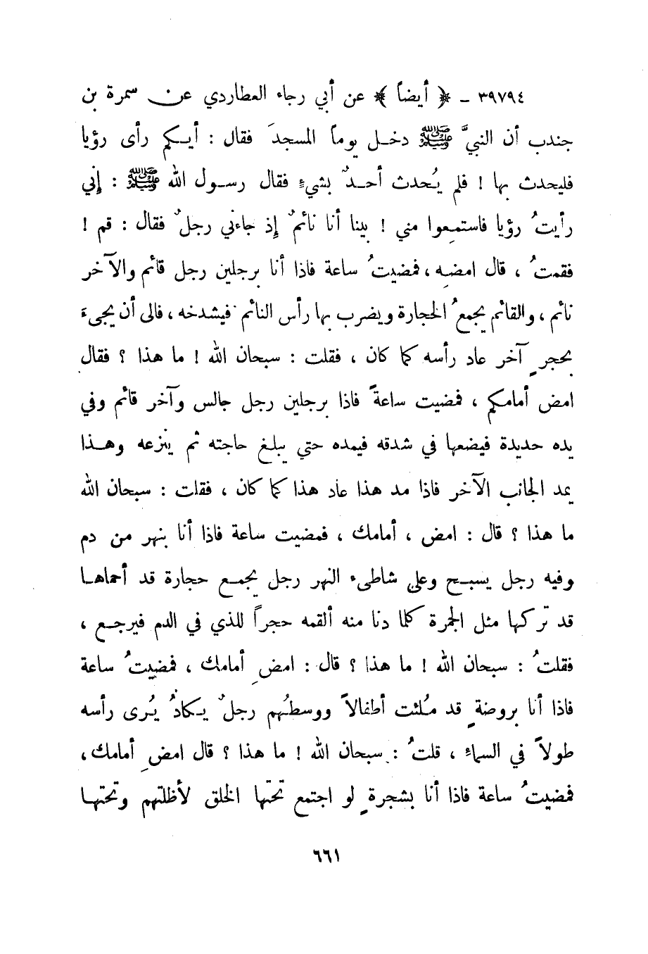 39794- "أيضا" عن أبي رجاء العطاردي عن سمرة بن جندب أن النبي صلى الله عليه وسلم دخل يوما المسجد فقال: "أيكم رأى رؤيا فليحدث بها! فلم يحدث أحد بشيء فقال رسول الله صلى الله عليه وسلم: إني رأيت رؤيا فاستمعوا مني! بينا أنا نائم إذ جاءني رجل فقال: قم! فقمت، قال امضه، فمضيت ساعة فإذا أنا برجلين رجل قائم والآخر نائم، والقائم يجمع الحجارة ويضرب بها رأس النائم فيشدخه، فإلى أن يجيء بحجر آخر عاد رأسه كما كان، فقلت: سبحان الله! ما هذا؟ فقال امض أمامكم، فمضيت ساعة فإذا برجلين رجل جالس وآخر قائم وفي يده حديدة فيضعها في شدقه فيمده حتى يبلغ حاجته ثم ينزعه وهذا يمد الجانب الآخر فإذا مد هذا عاد هذا كما كان، فقلت: سبحان الله ما هذا؟ قال: امض، أمامك، فمضيت ساعة فإذا أنا بنهر من دم وفيه رجل يسبح وعلى شاطئ النهر رجل يجمع حجارة قد أحماها قد تركها مثل الجمرة كلما دنا منه ألقمه حجرا للذي في الدم فيرجع، فقلت: سبحان الله! ما هذا؟ قال: امض أمامك، فمضيت ساعة فإذا أنا بروضة قد ملئت أطفالا ووسطهم رجل يكاد يرى رأسه طولا في السماء، قلت: سبحان الله! ما هذا؟ قال امض أمامك، فمضيت ساعة فإذا أنا بشجرة لو اجتمع تحتها الخلق لأظلتهم وتحتها