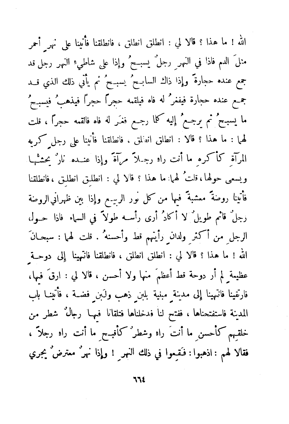 الله! ما هذا؟ قالا لي: انطلق انطلق، فانطلقنا فأتينا على نهر أحمر مثل الدم فإذا في النهر رجل يسبح وإذا على شاطيء النهر رجل قد جمع عنده حجارة وإذا ذاك السابح يسبح ثم يأتي ذلك الذي قد جمع عنده حجارة فيفغر له فاه فيلقمه حجرا حجرا فيذهب فيسبح ما يسبح ثم يرجع إليه كلما رجع فغر له فاه فالقمه حجرا قلت لهما: ما هذا؟ قالا: انطلق انطلق، فانطلقنا فأتينا على رجل كريه المرآة كأكره ما أنت راء رجلا مرآة وإذا عنده نار يحشها ويسعى حولها، قلت لهما: ما هذا؟ قالا لي: انطلق انطلق، فانطلقنا فأتينا روضة معشبة فيها من كل نور الربيع وإذا بين ظهراني الروضة رجل قائم طويل لا أكاد أرى رأسه طولا في السماء فإذا حول الرجل من أكثر ولدان رأيتهم قط وأحسنه. قلت لهما: سبحان الله! ما هذا؟ قالا لي: انطلق انطلق، فانطلقنا فانتهينا إلى دوحة عظيمة لم أر دوحة قط أعظم منها ولا أحسن، قالا لي: ارق فيها، فارتقينا فانتهينا إلى مدينة مبنية بلبن ذهب ولبن فضة، فأتينا باب المدينة فاستفتحناها، ففتح لنا فدخلناها فتلقانا فيها رجال شطر من خلقهم كأحسن ما أنت راء وشطر كأقبح ما أنت راء رجلا، فقالا لهم: اذهبوا: فقعوا في ذلك النهر! وإذا نهر معترض يجري
