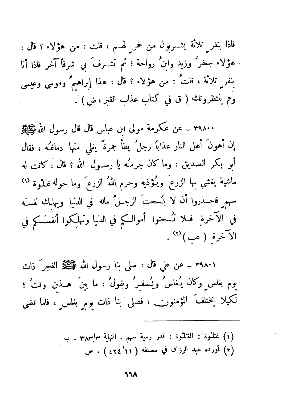 39800- عن عكرمة مولى ابن عباس قال قال رسول الله صلى الله عليه وسلم "إن أهون أهل النار عذابا رجل يطأ جمرة يغلي منها دماغه، فقال أبو بكر الصديق: وما كان جرمه يا رسول الله؟ قال: كانت له ماشية يغشي بها الزرع ويؤذيه وحرم الله الزرع وما حوله غلوة1 سهم فاحذروا أن لا يسحت الرجل ماله في الدنيا ويهلك نفسه في الآخرة فلا تسحتوا أموالكم في الدنيا وتهلكوا أنفسكم في الآخرة." عب"2