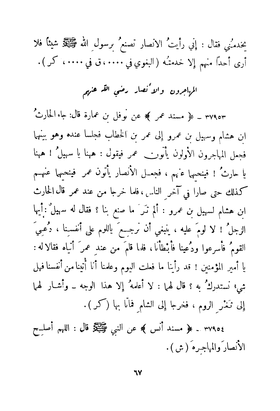 37953- "مسند عمر" عن نوفل بن عمارة قال: جاء الحارث ابن هشام وسهيل بن عمرو إلى عمر بن الخطاب فجلسا عنده وهو بينهما فجعل المهاجرون الأولون يأتون عمر فيقول: ههنا يا سهيل! ههنا يا حارث! فينحيهما عنهم، فجعل الأنصار يأتون عمر فينحيهما عنهم كذلك حتى صارا في آخر الناس، فلما خرجا من عند عمر قال الحارث ابن هشام لسهيل بن عمرو: ألم تر ما صنع بنا؟ فقال له سهيل: أيها الزجل! لا لوم عليه، ينبغي أن نرجع يا للوم على أنفسنا، دعي القوم فأسرعوا ودعينا فأبطأنا، فلما قام من عند عمر أتياه فقالا له: يا أمير المؤمنين! قد رأينا ما فعلت اليوم وعلمنا أنا أتينا من أنفسنا فهل شيء نستدرك به؟ قال لهما: لا أعلمه إلا هذا الوجه - وأشار لهما إلى ثغر الروم، فخرجا إلى الشام فماتا بها. "كر".