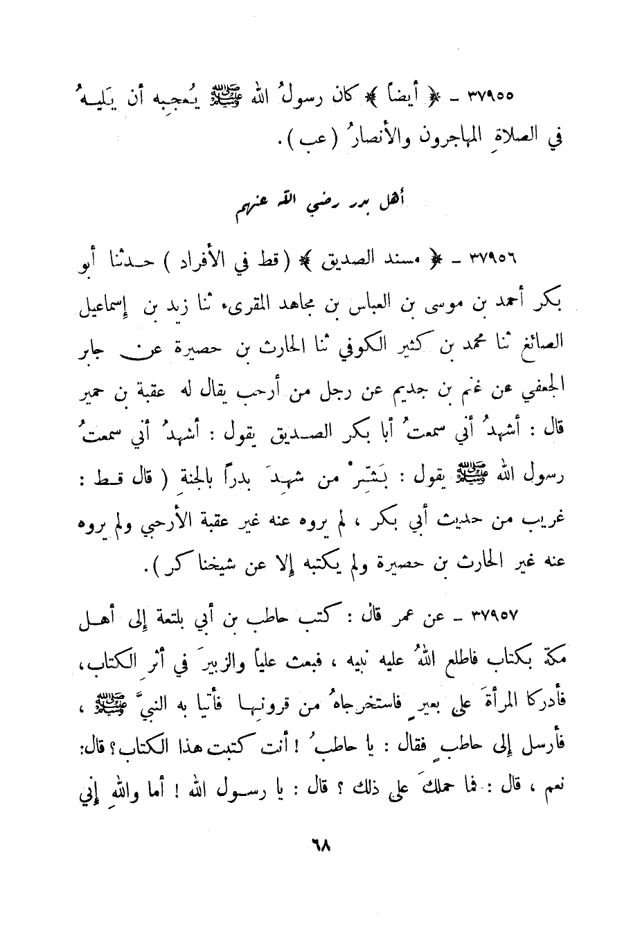 37956- "مسند الصديق" "قط في الأفراد" حدثنا أبو بكر أحمد بن موسى بن العباس بن مجاهد المقرئ ثنا زيد بن إسماعيل الصائغ ثنا محمد بن كثير الكوفي ثنا الحارث بن حصيرة عن جابر الجعفي عن غنم بن جديم عن رجل من أرحب يقال له عقبة بن حمير قال: أشهد أني سمعت أبا بكر الصديق يقول: أشهد أني سمعت رسول الله صلى الله عليه وسلم يقول: "بشر من شهد بدرا بالجنة". "قال قط: غريب من حديث أبي بكر، لم يروه عنه غير عقبة الأرحبي ولم يروه عنه غير الحارث بن حصيرة ولم يكتبه إلا عن شيخنا كر".