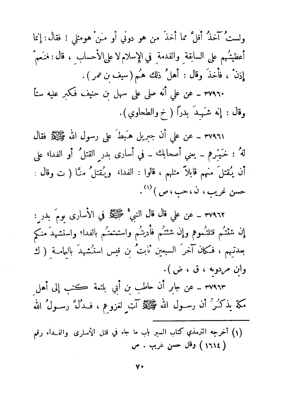 1 أخرجه الترمذي كتاب السير باب ما جاء في قتل الأسارى والفداء رقم "1614" وقال حسن غريب. ص.