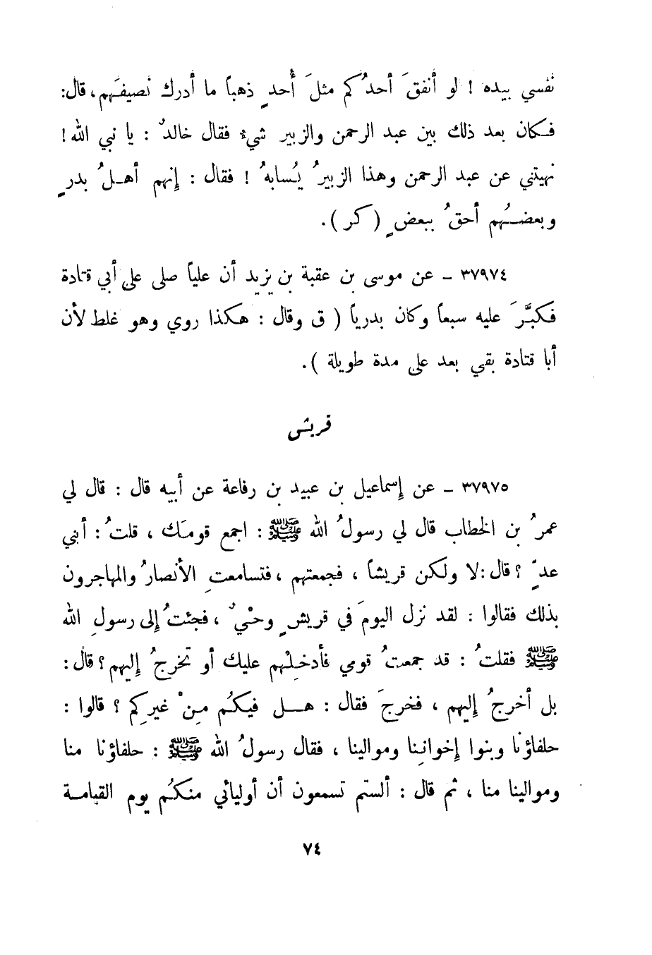37975- عن إسماعيل بن عبيد بن رفاعة عن أبيه قال: قال لي عمر بن الخطاب قال لي رسول الله صلى الله عليه وسلم: "اجمع قومك"، قلت: أبني عد؟ قال: "لا ولكن قريشا"، فجمعتهم، فتسامعت الأنصار والمهاجرون بذلك فقالوا: لقد نزل اليوم في قريش وحي، فجئت إلى رسول الله صلى الله عليه وسلم فقلت: قد جمعت قومي فأدخلهم عليك أو تخرج إليهم؟ قال: بل أخرج إليهم، فخرج فقال: هل فيكم من غيركم؟ قالوا: حلفاؤنا وبنوا إخواننا وموالينا، فقال رسول الله صلى الله عليه وسلم: "حلفاؤنا منا وموالينا منا، ثم قال: ألستم تسمعون أن أوليائي منكم يوم القيامة