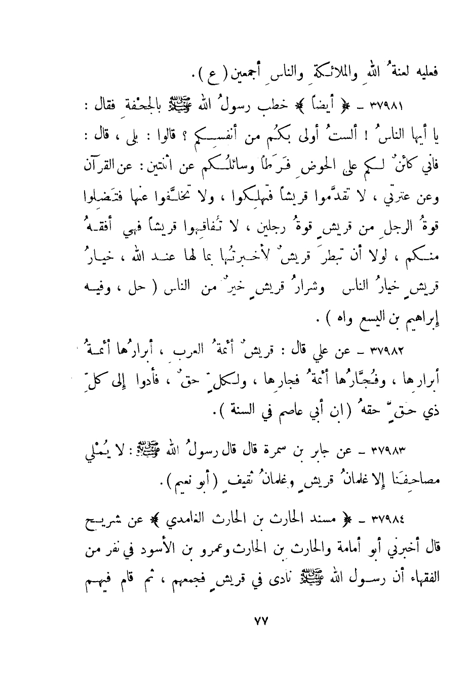 37982- عن علي قال: قريش أئمة العرب، أبرارها أئمة أبرارها، وفجارها أئمة فجارها، ولكل حق، فأدوا إلى كل ذي حق حقه."ابن أبي عاصم في السنة".
