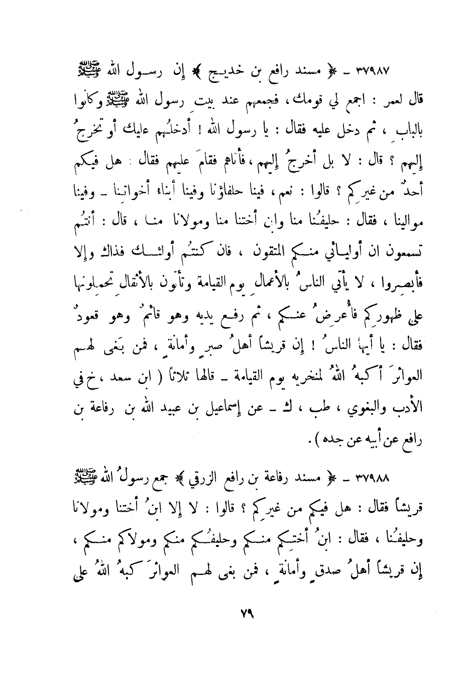 37988- "مسند رفاعة بن رافع الزرقي" جمع رسول الله صلى الله عليه وسلم قريشا فقال: "هل فيكم من غيركم؟ " قالوا: لا إلا ابن أختنا ومولانا وحليفنا، فقال: "ابن أختكم منكم وحليفكم منكم ومولاكم منكم، إن قريشا أهل صدق وأمانة، فمن بغى لهم العواثر كبه الله على