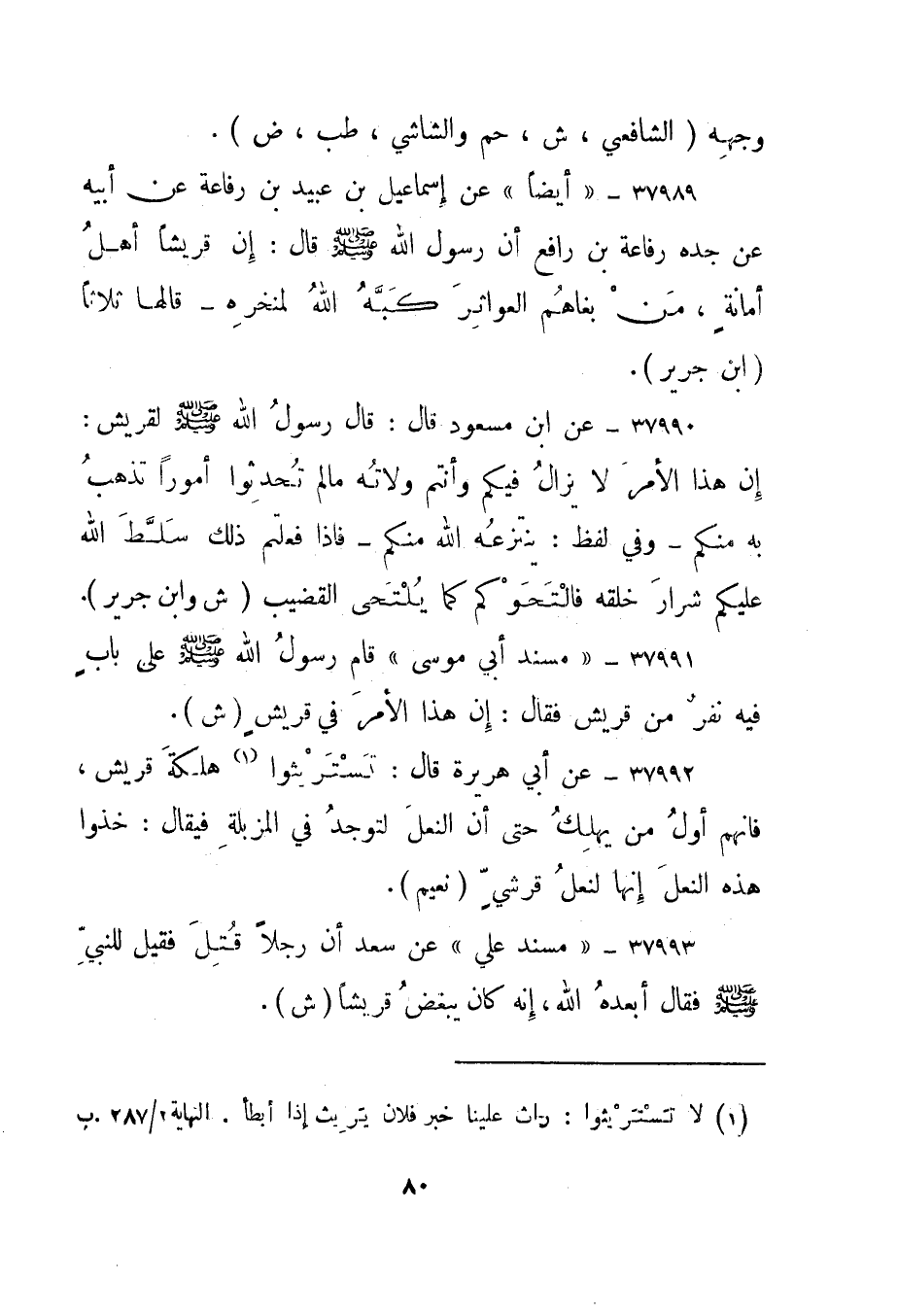 37992- عن أبي هريرة قال: تستريثوا1 هلكة قريش، فإنهم أول من يهلك حتى أن النعل لتوجد في المزبلة فيقال: خذوا هذه النعل إنها لنعل قرشي."نعيم".