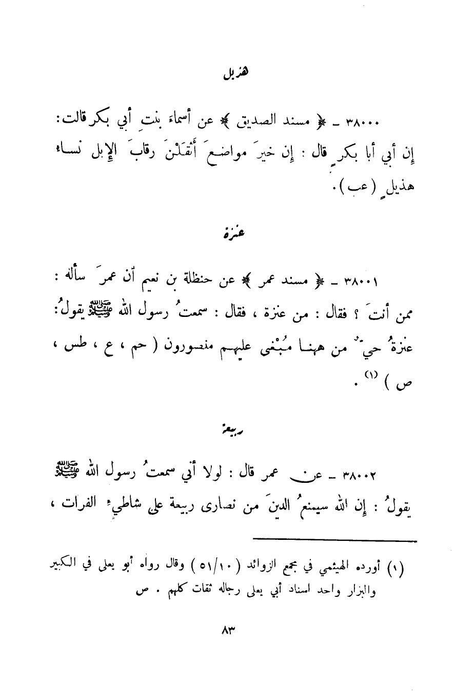 38000- "مسند الصديق" عن أسماء بنت أبي بكر قالت: إن أبي أبا بكر قال: إن خير مواضع أثقلن رقاب الإبل نساء هذيل."عب".