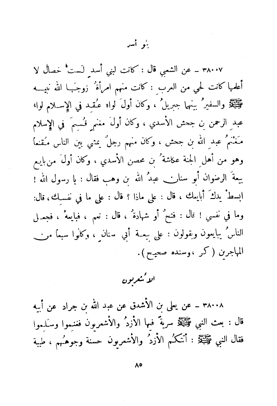 38007- عن الشعبي قال: كانت لبني أسد لست خصال لا أعلمها كانت لحي من العرب: كانت منهم امرأة زوجها الله نبيه صلى الله عليه وسلم والسفير بينهما جبريل، وكان أول لواء عقد في الإسلام لواء عبد الرحمن بن جحش الأسدي، وكان أول مغنم قسم في الإسلام مغنم عبد الله بن جحش، وكان منهم رجل يمشي بين الناس مقنعا وهو من أهل الجنة عكاشة بن محصن الأسدي، وكان أول من بايع بيعة الرضوان أبو سنان عبد الله بن وهب فقال: يا رسول الله! ابسط يدك أبايعك، قال: "على ماذا؟ " قال: على ما في نفسك، قال: "وما في نفسي! " قال: فتح أو شهادة، قال: "نعم،" فبايعه، فجعل الناس يبايعون ويقولون: على بيعة أبي سنان، وكانوا سبعا من المهاجرين."كر، وسنده صحيح".
