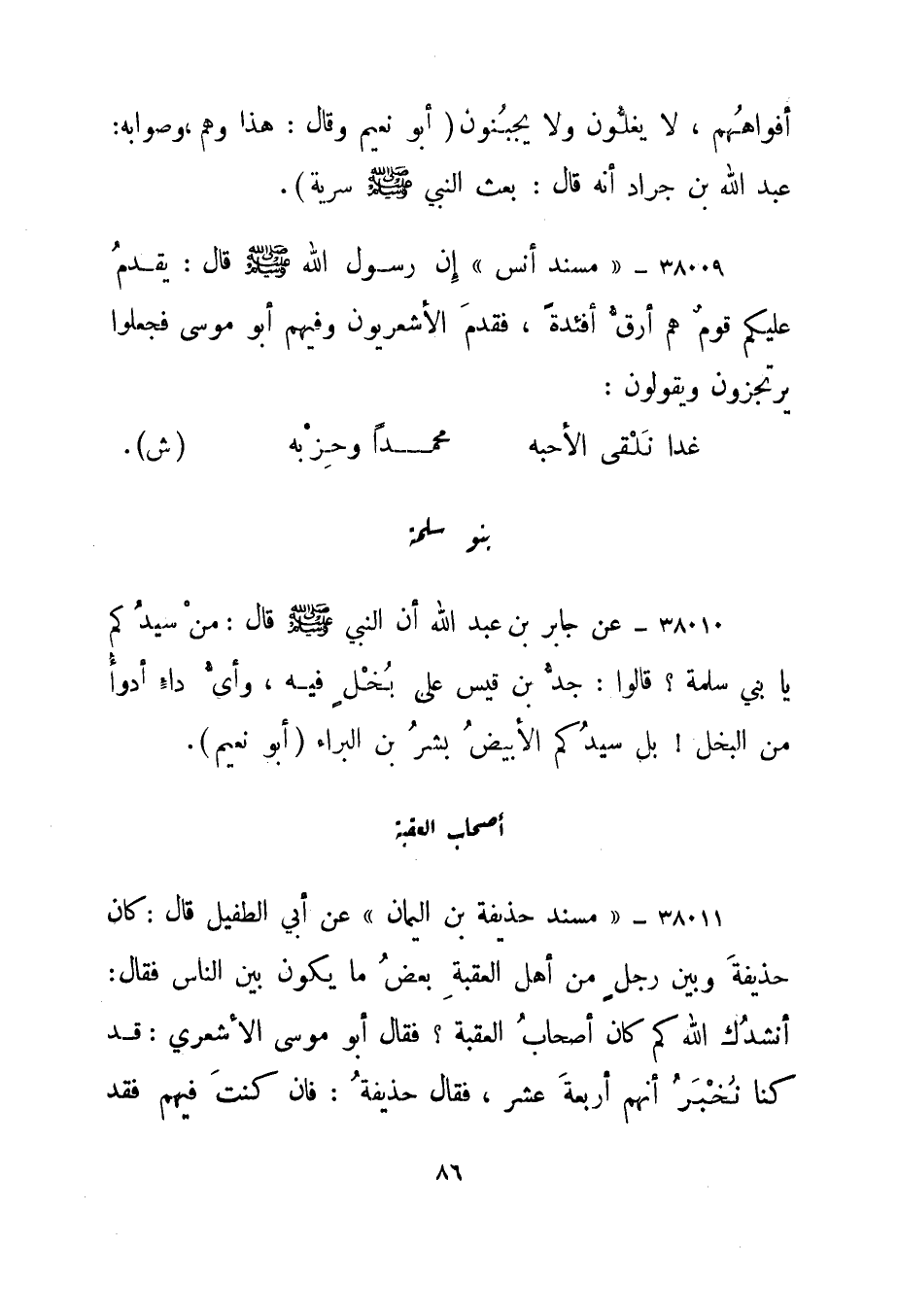 38011- "مسند حذيفة بن اليمان" عن أبي الطفيل قال: كان بين حذيفة وبين رجل من أهل العقبة بعض ما يكون بين الناس فقال: أنشدك الله كم كان أصحاب العقبة؟ فقال أبو موسى الأشعري: قد كنا نخبر أنهم أربعة عشر، فقال حذيفة: فإن كنت فيهم فقد