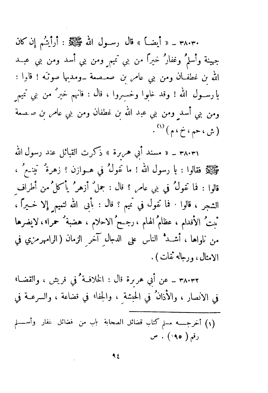 38031- "مسند أبي هريرة" ذكرت القبائل عند رسول الله صلى الله عليه وسلم فقالوا: يا رسول الله! ما تقول في هوزان؟ "زهرة تينع"، قالوا: فما تقول في بني عامر؟ قال: "جمل أزهر يأكل من أطراف الشجر"، قالوا: فما تقول في تميم؟ قال: "يأبى الله لتميم إلا خيرا، ثبت الأقدام، عظام الهام، رجح الأحلام، هضبة حمراء، لا يضرها من ناواها، أشد الناس على الدجال آخر الزمان". "الرامهرمزي في الأمثال، ورجاله ثقات".