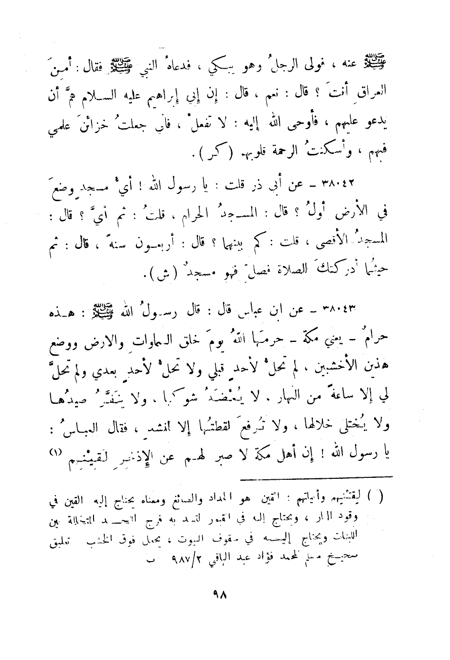 38042- عن أبي ذر قلت: يا رسول الله! أي مسجد وضع في الأرض أول؟ قال: "المسجد الحرام،" قلت: ثم أي؟ قال: "المسجد الأقصى،" قلت: كم بينهما؟ قال: "أربعون سنة،" قال: "ثم حيثما أدركتك الصلاة فصل فهو مسجد". "ش".