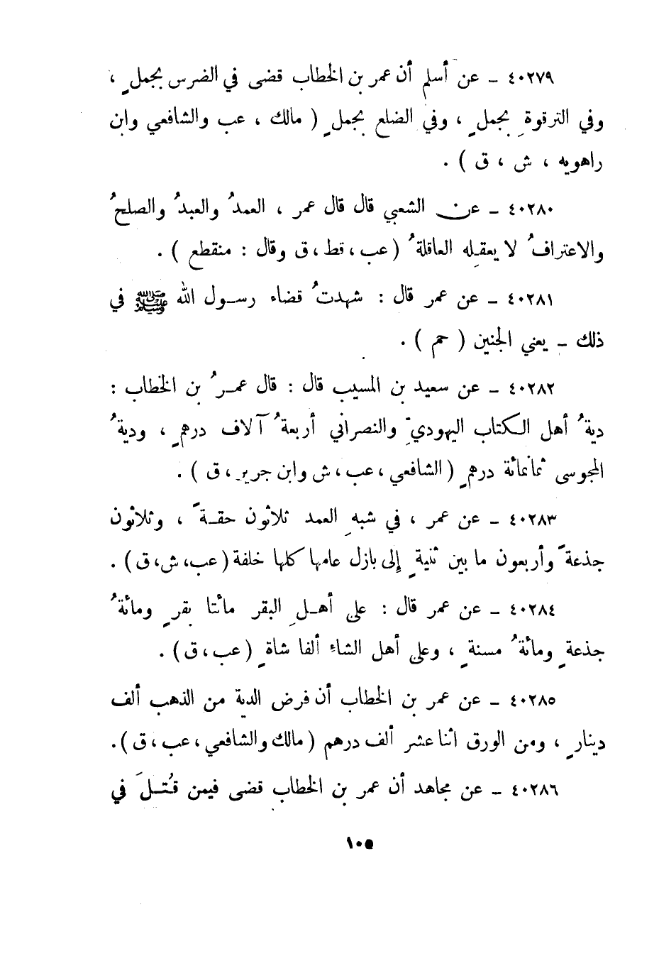40282- عن سعيد بن المسيب قال: قال عمر بن الخطاب: دية أهل الكتاب اليهودي والنصراني أربعة آلاف درهم، ودية المجوسي ثمانمائة درهم."الشافعي، عب، ش وابن جرير، ق".