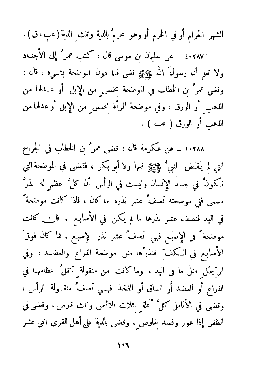 40287- عن سليمان بن موسى قال: كتب عمر إلى الأجناد ولا نعلم أن رسول الله صلى الله عليه وسلم قضى فيما دون الموضحة بشيء، قال: وقضى عمر بن الخطاب في الموضحة بخمس من الإبل أو عدلها من الذهب أو الورق، وفي موضحة المرأة بخمس من الإبل أو عدلها من الذهب أو الورق."عب".