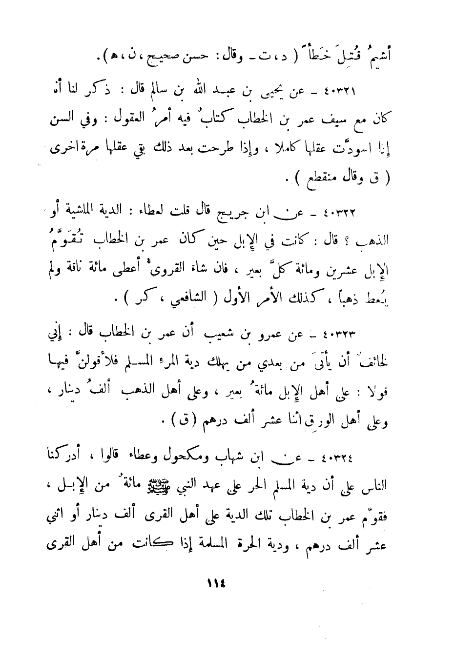 40324- عن ابن شهاب ومكحول وعطاء قالوا، أدركنا الناس على أن دية المسلم الحر على عهد النبي صلى الله عليه وسلم مائة من الإبل، فقوم عمر بن الخطاب تلك الدية على أهل القرى ألف دينار أو اثني عشر ألف درهم، ودية الحرة المسلمة إذا كانت من أهل القرى
