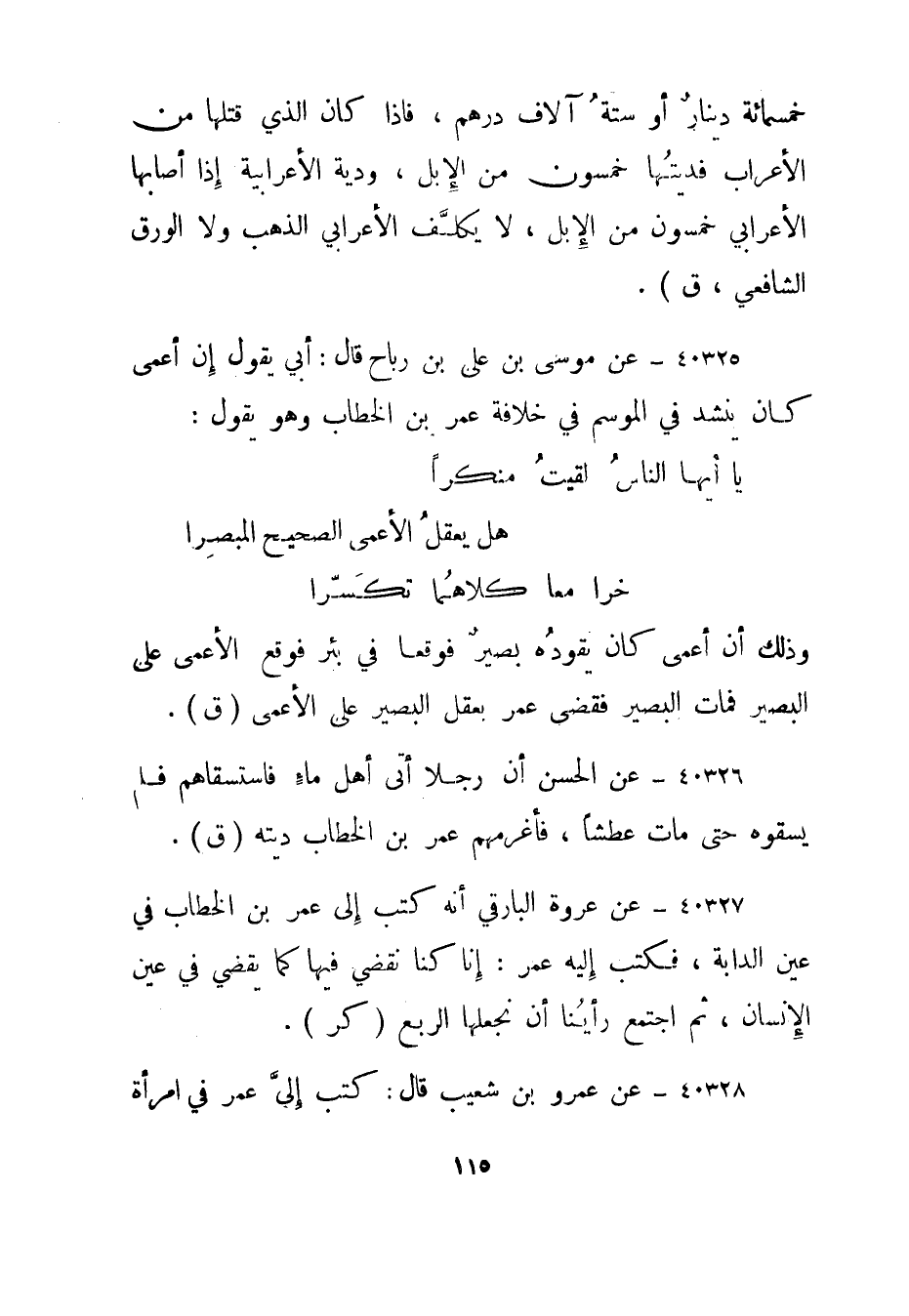40327- عن عروة البارقي أنه كتب إلى عمر بن الخطاب في عين الدابة، فكتب إليه عمر: إنا كنا نقضي فيها كما يقضي في عين الإنسان، ثم اجتمع رأينا أن نجعلها الربع."كر".