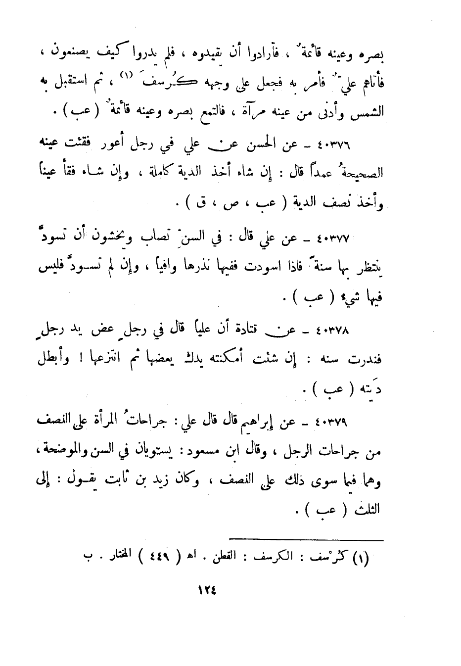 40376- عن الحسن عن علي في رجل أعور فقئت عينه الصحيحة عمدا قال: إن شاء أخذ الدية كاملة، وإن شاء فقأ عينا وأخذ نصف الدية."عب، ص، ق".